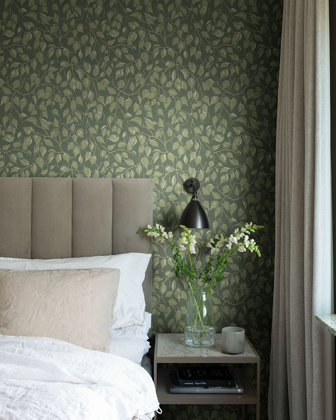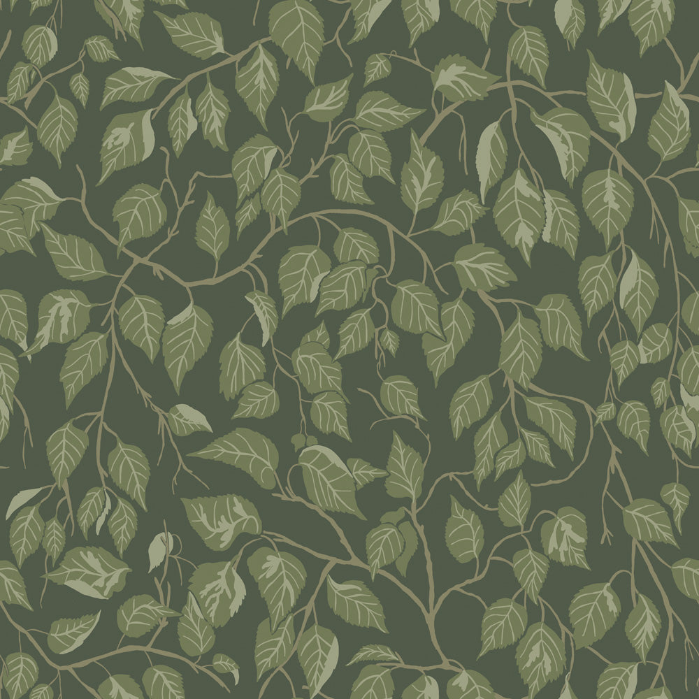 Utanför fönstret finns en stor hängbjörk. Stora delar av året existerar den bara som träd. Men när våren och sommaren träder in förvandlas den och du bor som i en trädkoja och världen utanför göms och glöms. I tapeten Hängbjörk med mörkgrön botten och ett slingrande lövverk i olika gröna nyanser omsluts du av björkens rodyllda formationer och får ett rum som andas lugn.