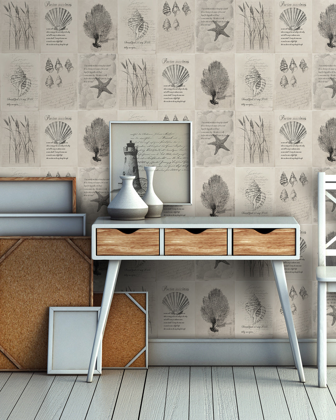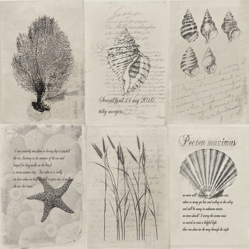 Ett romantiskt svartvitt mönster på en beige botten med kustens fynd. För minnena tillbaka till den varma årstidens vackra omgivning där havets bris når fram och kvällens strålar värmer skönt.