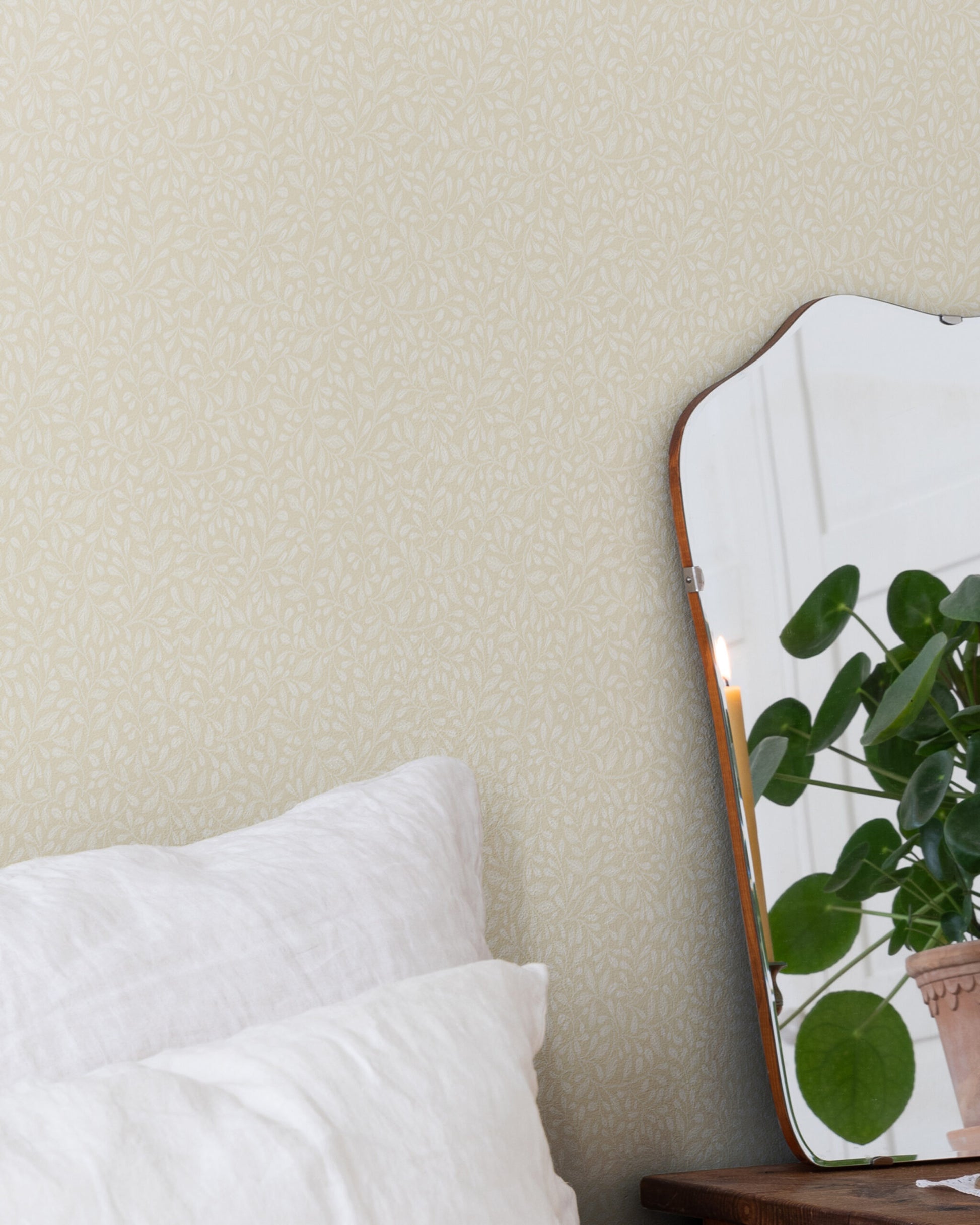Tapeten Adam i en rofylld och inbjudande färgställning. Dess tidlösa mönster av ljusa bladslingor mot en varm beige nästan mild gul botten gör tapeten enkel att matcha med andra tapeter och passar lika fint in i vardagsrummet som i köket.