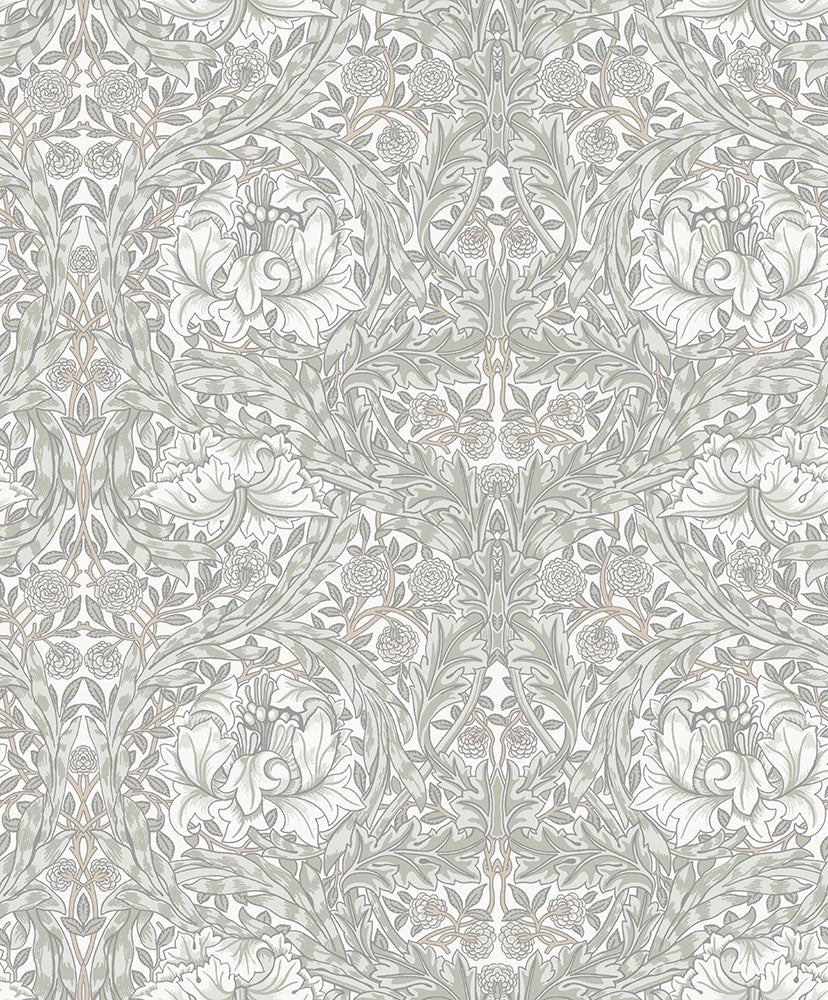 Tapeten African Marigolds livliga mönster som tar för sig av rummet dämpas något i denna färgställning av olika grå nyanser. De fordiga liljorna som vävs samman med ringblommor känns utan tvekan som ett typiskt Morris-mönster. Trots att mönstret har sitt ursprung från 1800-talet passar det tack vare sin tidlösa charm våra hem även idag.
