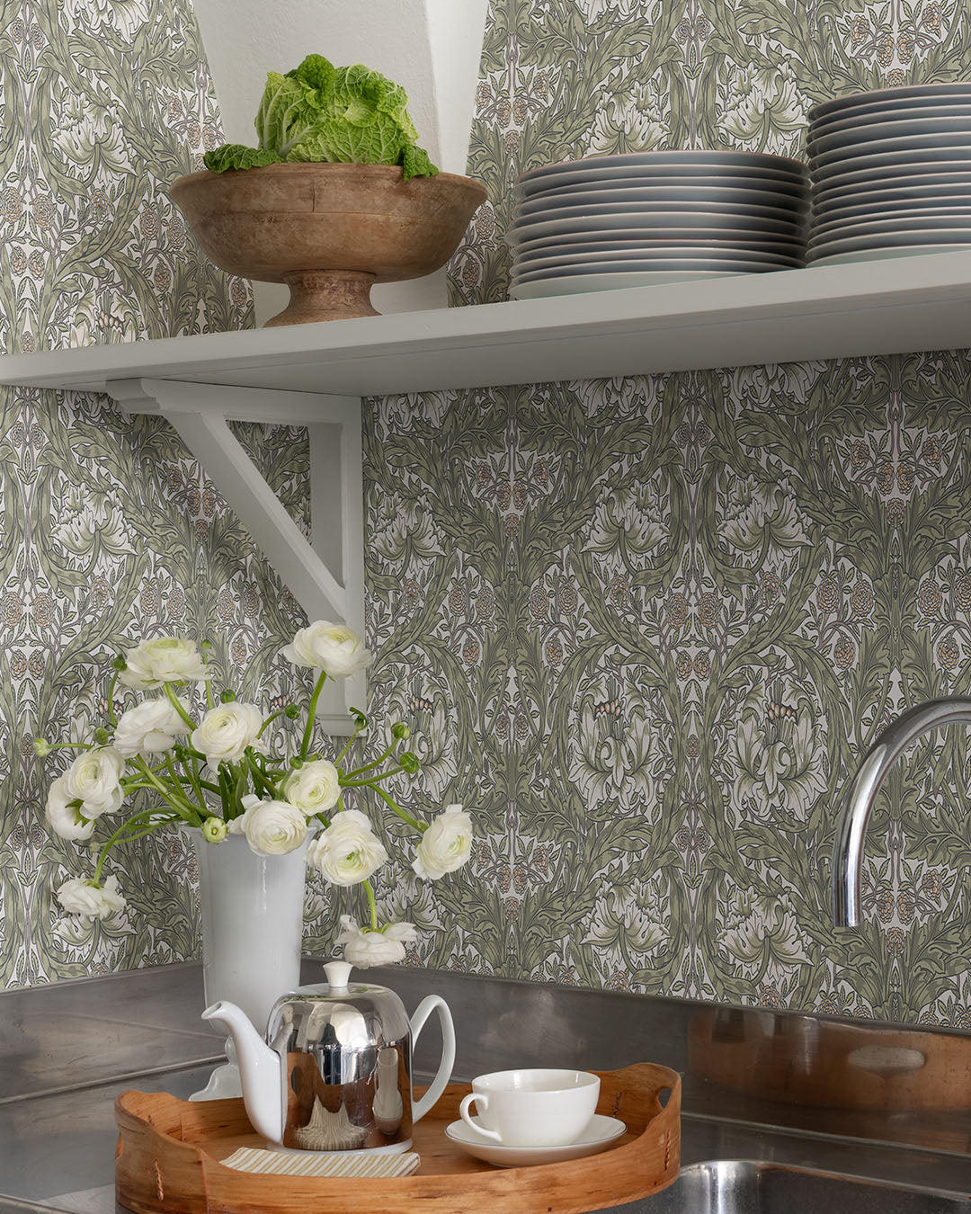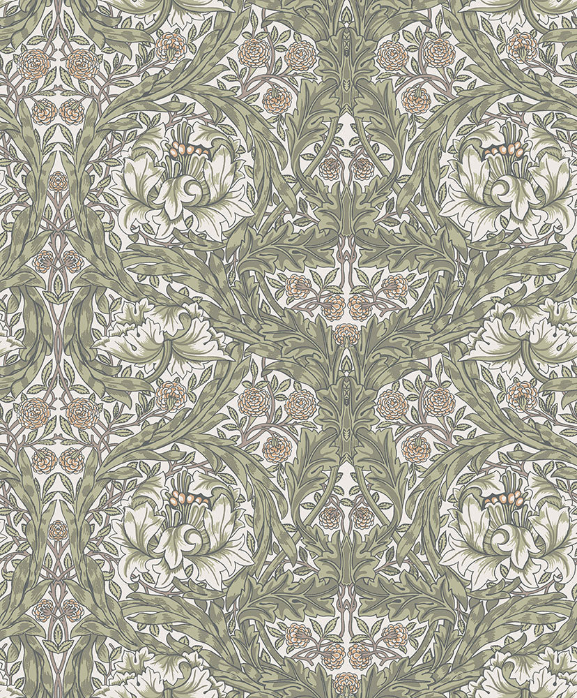 Vill du ha ett tidlöst rum som andas karaktär? Tapeten African Marigold från William Morris skapades 1876 och låter väggarna tala om en tid för längesedan samtidigt som den skapar en gemytlig hemkänsla i det moderna hemmet. Den dova gröna nyansen i de klättrande bladen och en soft ton av terrakotta i blommorna sprider en mjuk och behaglig känsla i rummet.