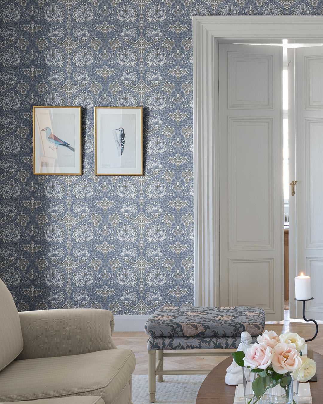 Det intrikata mönstret African Marigold väver samman blad och blommor på ett förtrollande sätt. De tycks frodas och växa sig uppåt med kraft i all oändlighet längs väggarna. De sirliga bladen i mjuk blå nyans flätas samman med blad och blommor i dov grön och beige nyans. Detta mönster skapades av William Morris år 1876.