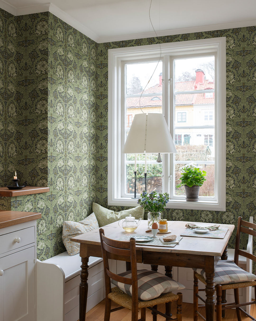 Tapeten African Marigold har ett klassiskt William Morris uttryck designad 1876. På en mörkblå botten finner du ett slingrande nät av ringblommor med stjälkar och blad i nyanser av blått, brunt och vitt. Ovanpå kommer ytterligare ett lager med stora dekorativa liljor i ljusgrönt som omsluts av pilblad i nynaser av grönt. Allt harmonierar fint tillsammans och skapar en tapet med vackert djup för hemmets väggar.