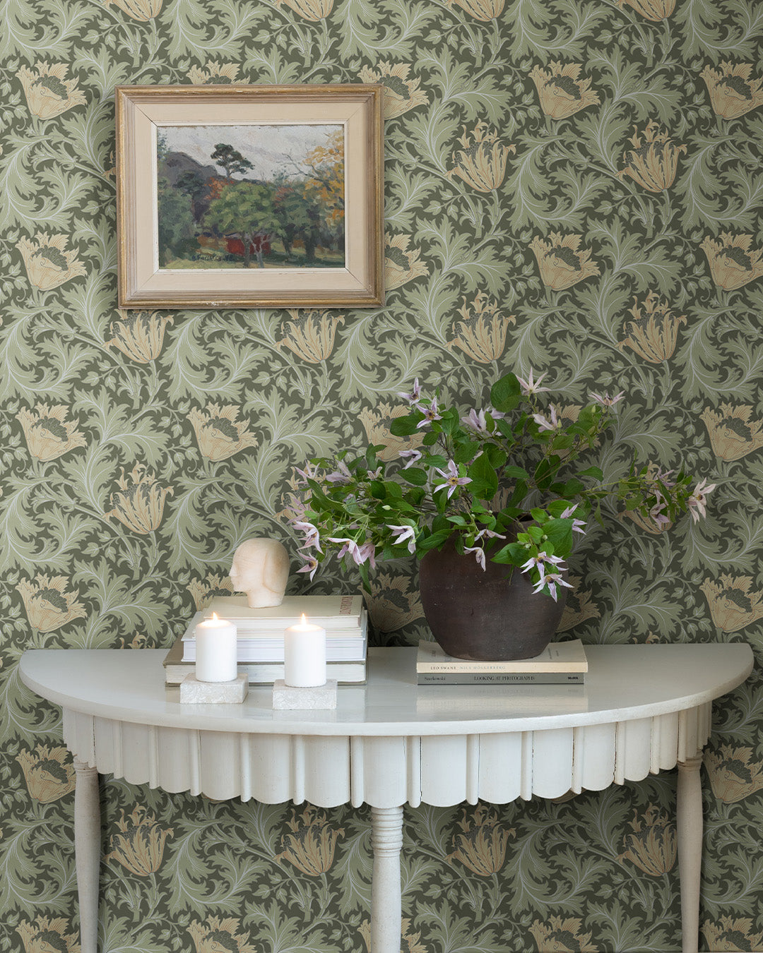 Anemone, som är en skiss från sent 1890-tal är en tidlös tapet som bidrar till en avslappnad miljö med sitt moderna och mjuka inslag. Tapeten har en grön botten som möts av ett taggigt ljusgrönt bladverk med Anemone blommor i beige.