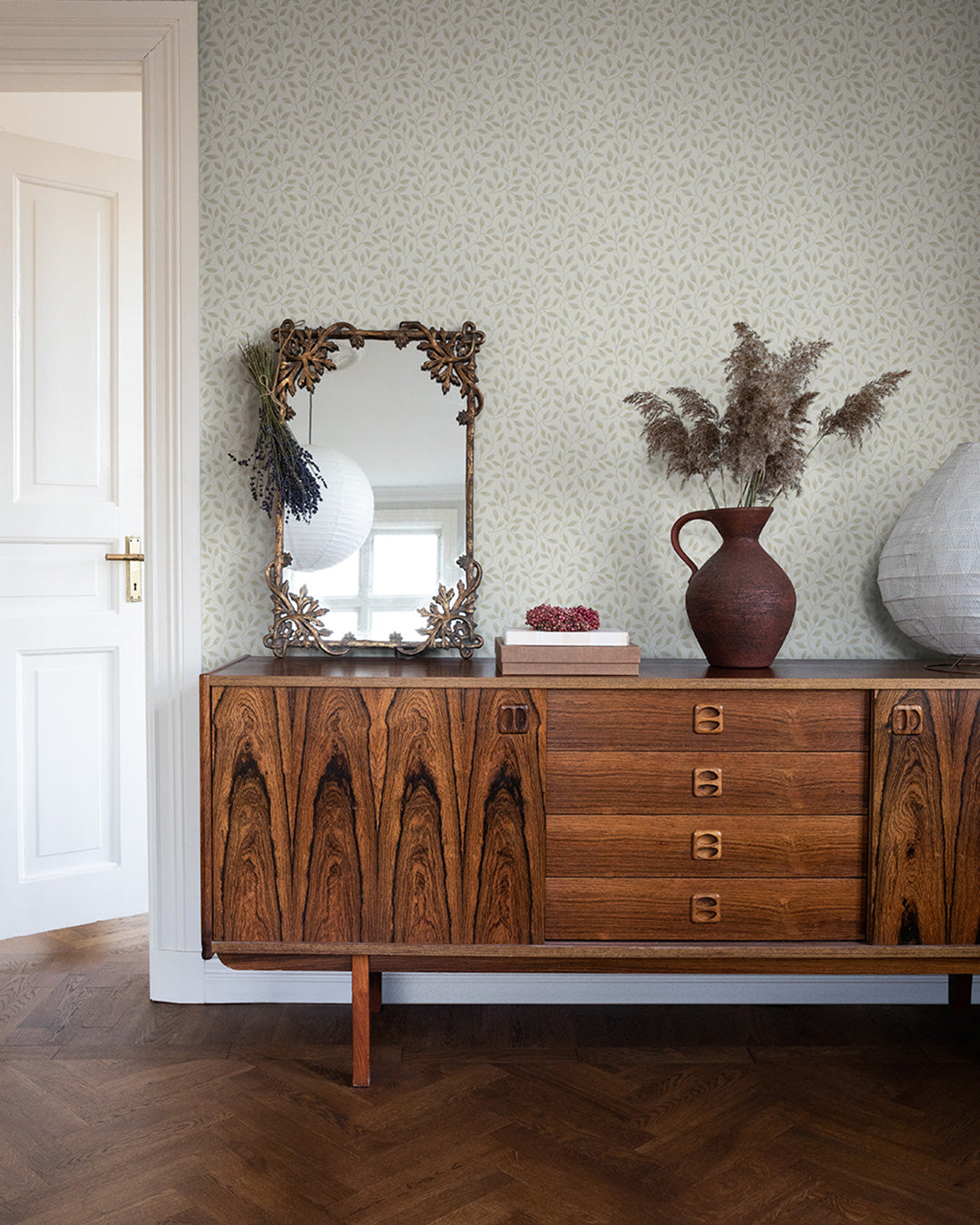 Apelkvist med sin milda färgställning och slingrande bladmönster i silver och grått är ett utmärkt val för den som vill ge sina väggar ett diskret mönster. Låt tapetens milda och dämpade blad vandra längs hemmets väggar och ge liv till dina rum. Ett av alla omtyckta mönster kollektionen Apelviken designad av Hanna Wedenlbo.