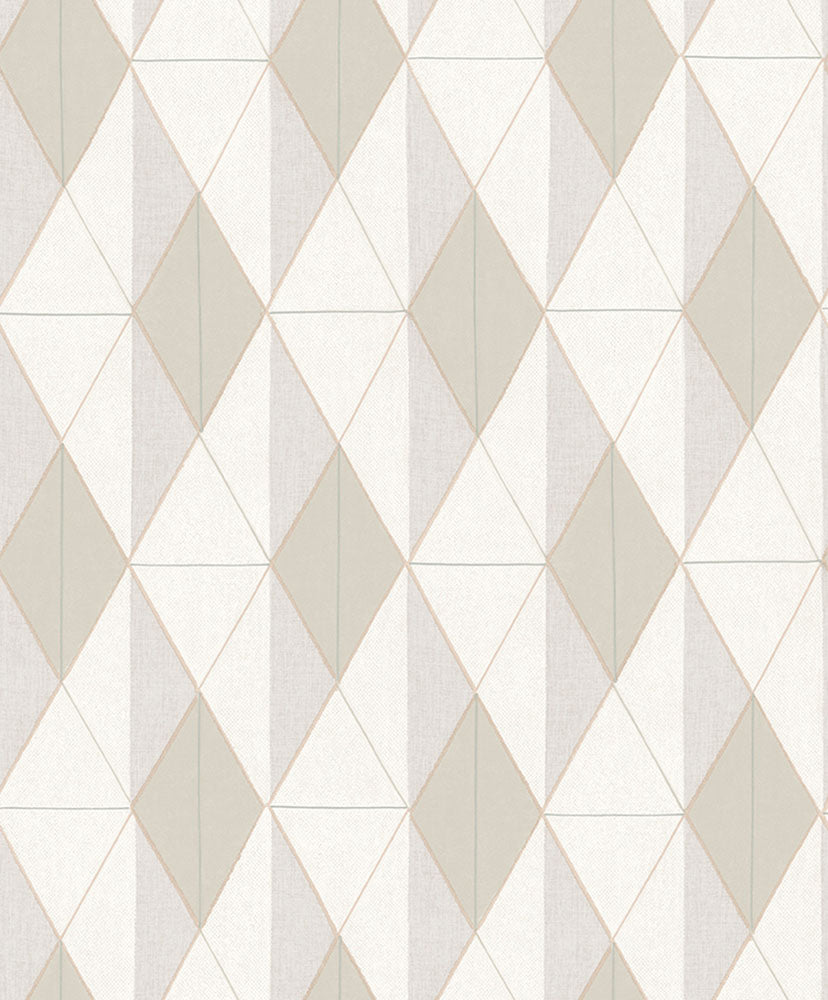 Tapeten Arlequine i stilrena kulörer, vitt, beige och guld. Tillsammans sammanstrålar dessa i ett geometriskt mönster. För dig som söker en diskret tapet som får dina väggar att stillsamt tala.