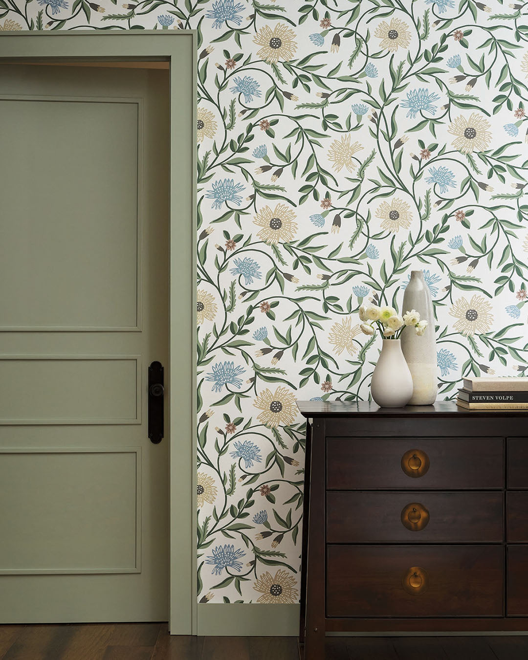 Tapet Aster är en dekorativ blomtapet med slingrande rankor som ramar in stiliserade asterblommor. De större blommorna går i beige och de mindre i dimmblått. Knopparna är i nyanser av beige och taupe och omges av smala blad i dämpade oliv- och salviagröna toner. Allt ligger mot en klar vit botten som gör mönstret ljust och luftigt. Helhetsintrycket är fräscht och lätt med en handmålad mjuk, naturlig känsla.