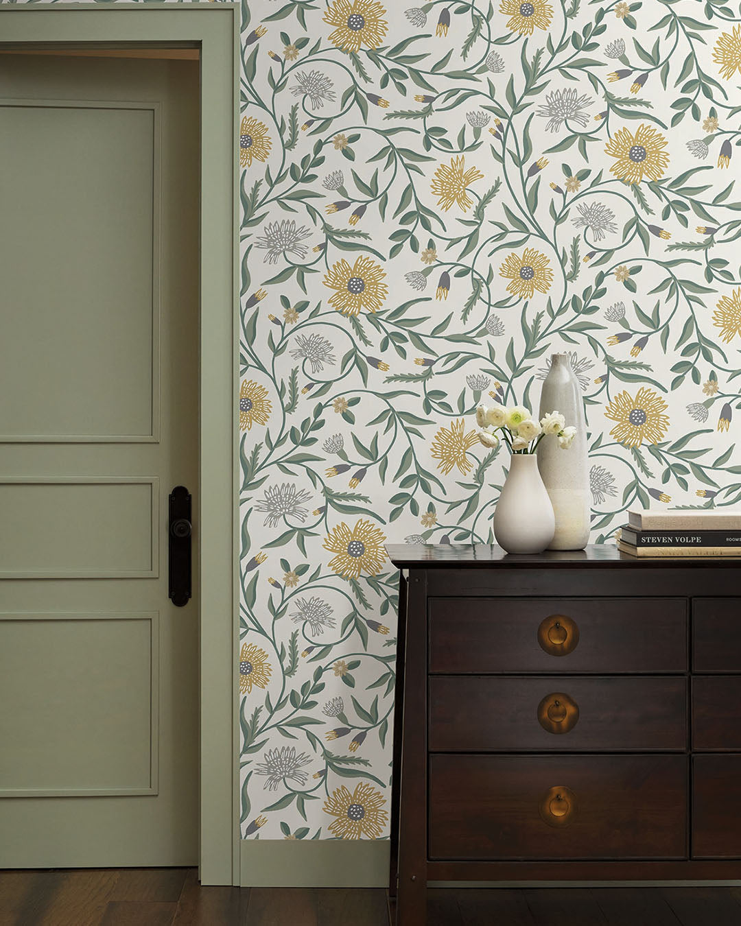 Tapet Aster är en dekorativ blomtapet med slingrande rankor som ramar in stiliserade asterblommor. De större blommorna går i guldmetallic och de mindre i grått. Knopparna är i guldmetallic och mörkgrått och omges av smala blad i dämpade oliv- och salviagröna toner. Allt ligger mot en vit botten som gör mönstret luftigt. Helhetsintrycket är ljust och elegant med en mjuk, naturlig känsla där blommorna i guldmetallic fångar ljuset och adderar ett subtilt, sofistikerat skimmer utan att ta över.