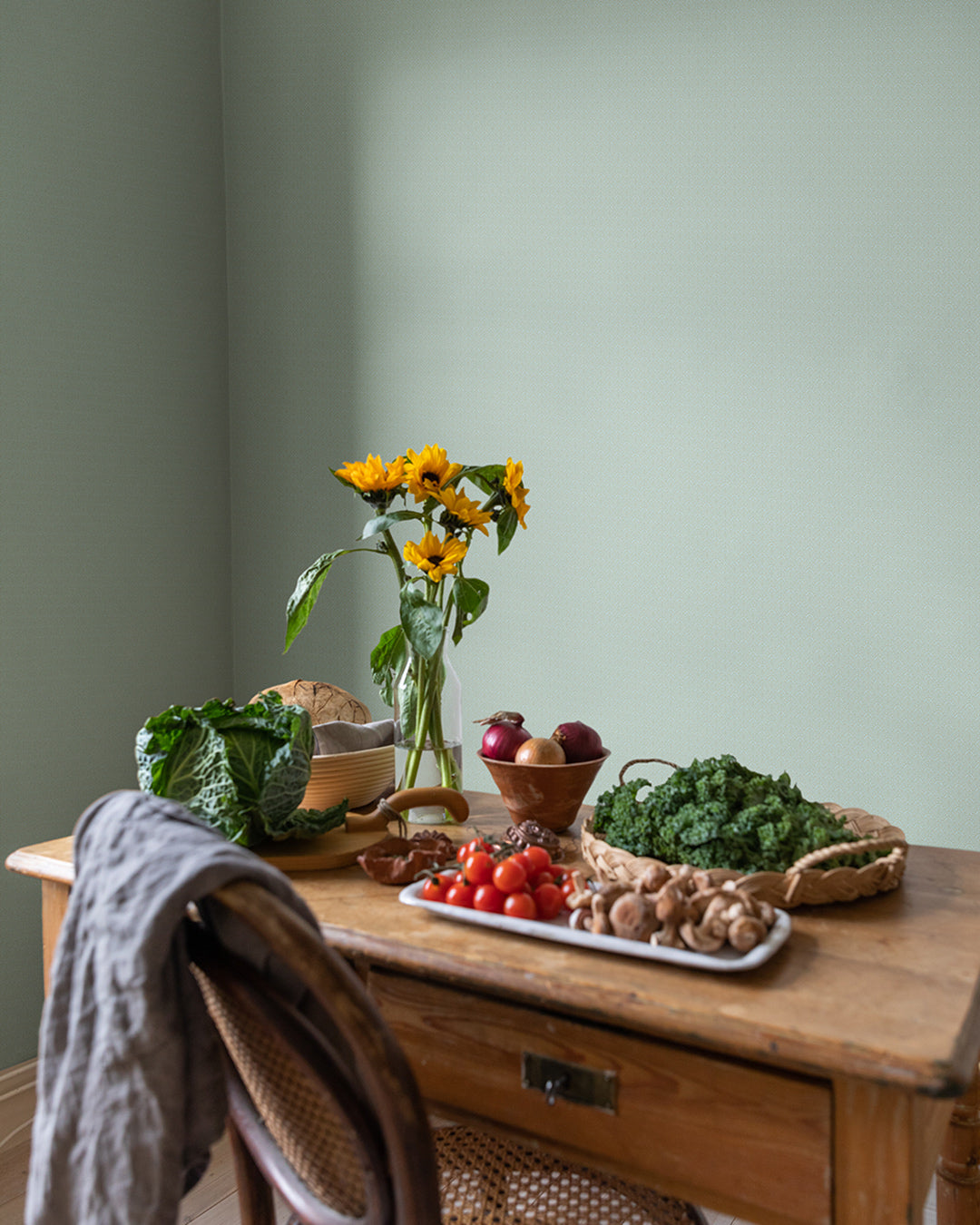 Ljus- och mörkgrön tapet i ett grafiskt solfjädermönster där en halvcirkel svävar över en liten blomma. Detta mönstret ser vi som både elegant och lantligt på grund av tapetens simplicitet. "Athena" ser vi i 6 mjuka färgställningar.
