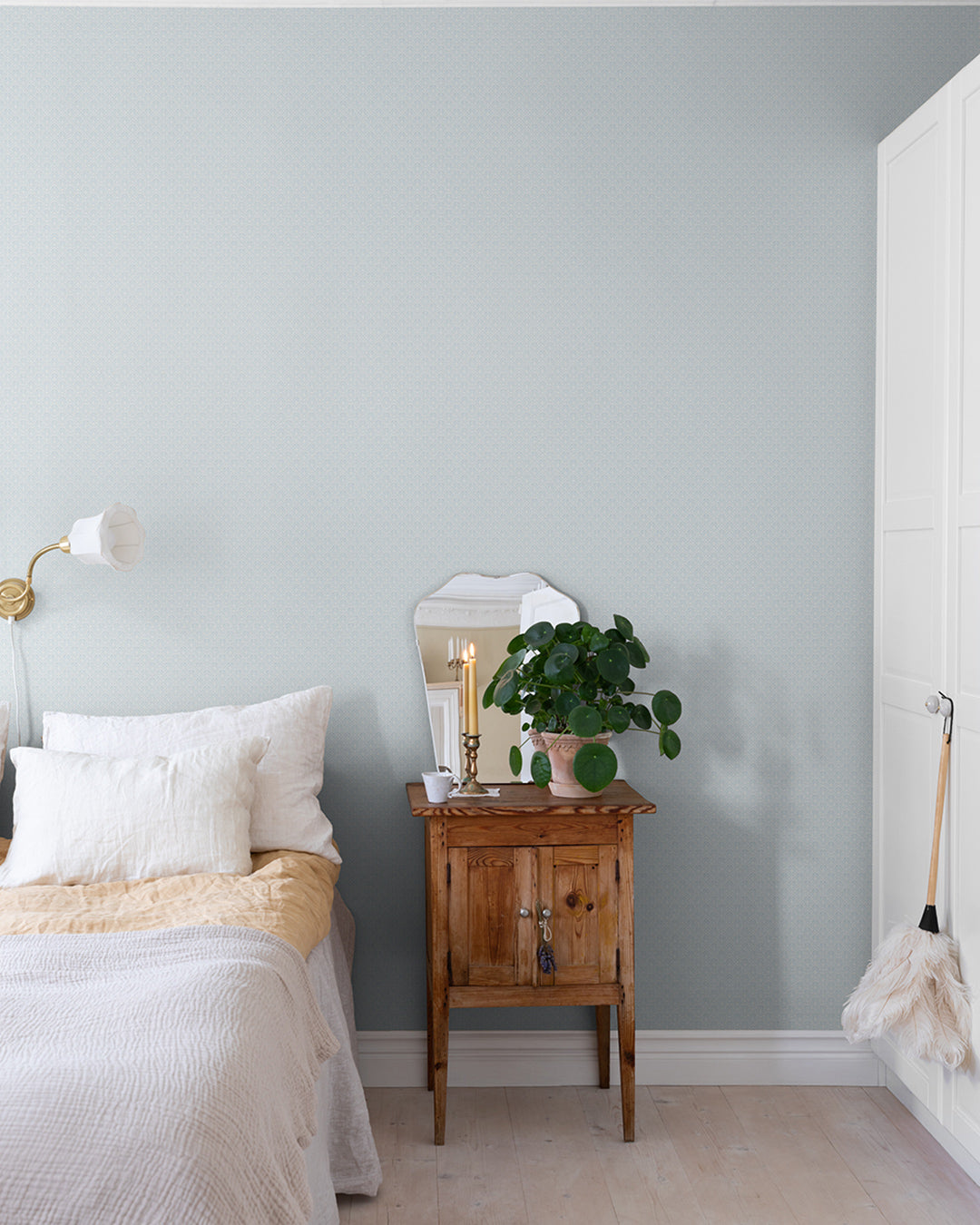 Småmönstrad ljusblå tapet med ett diskret trellis-inspirerat mönster. Detta minimalistiska tapetmönster passar fantastiskt både till ditt hemmakontor likaväl som till barnrum eller vardagsrum. Detta är en fantastisk tapet för att komplettera och spegla din interiör, den är där och förhöjer men tar inte för stor plats. På det viset är den en klassisk svensk design, perfekt mängd av lagom.