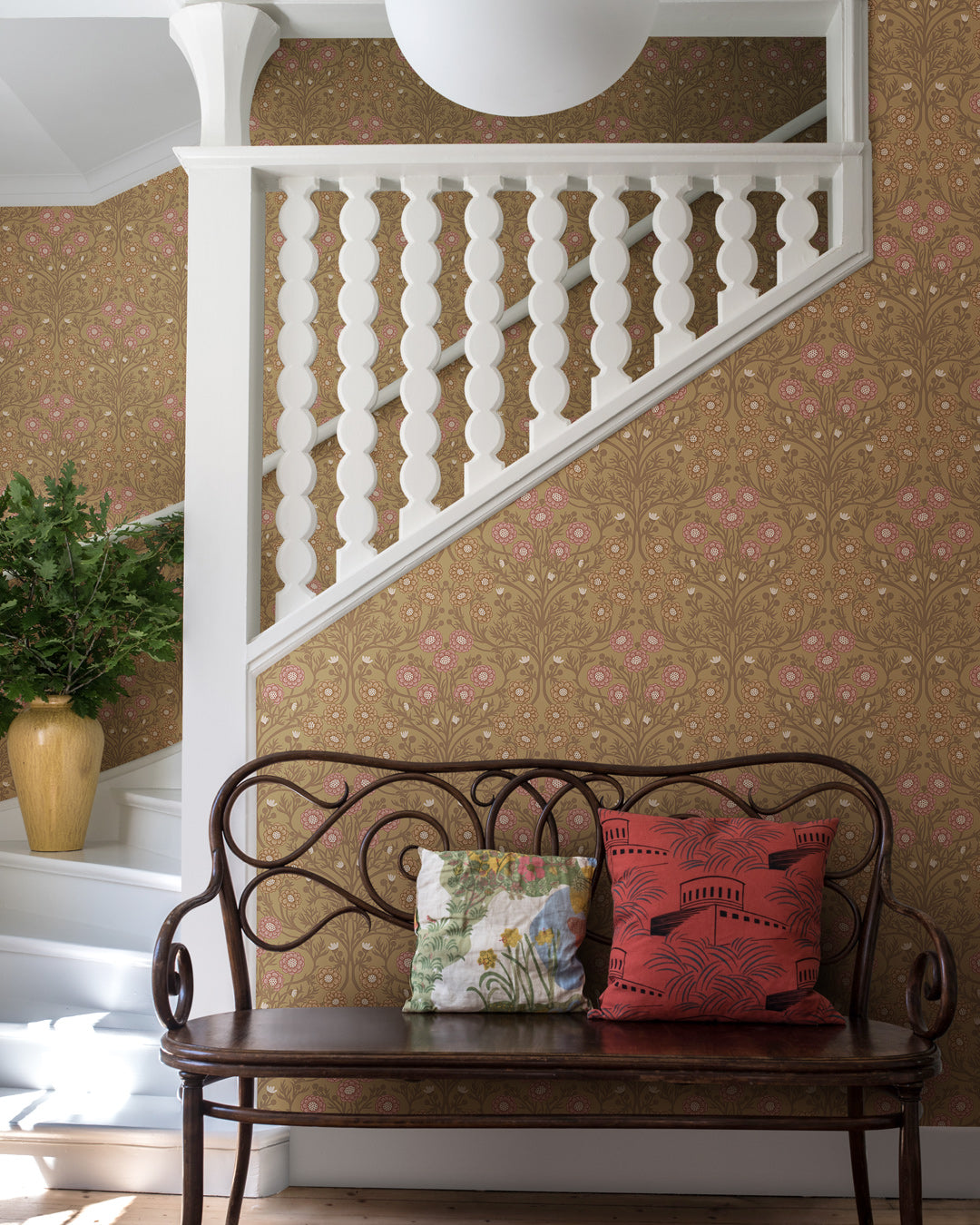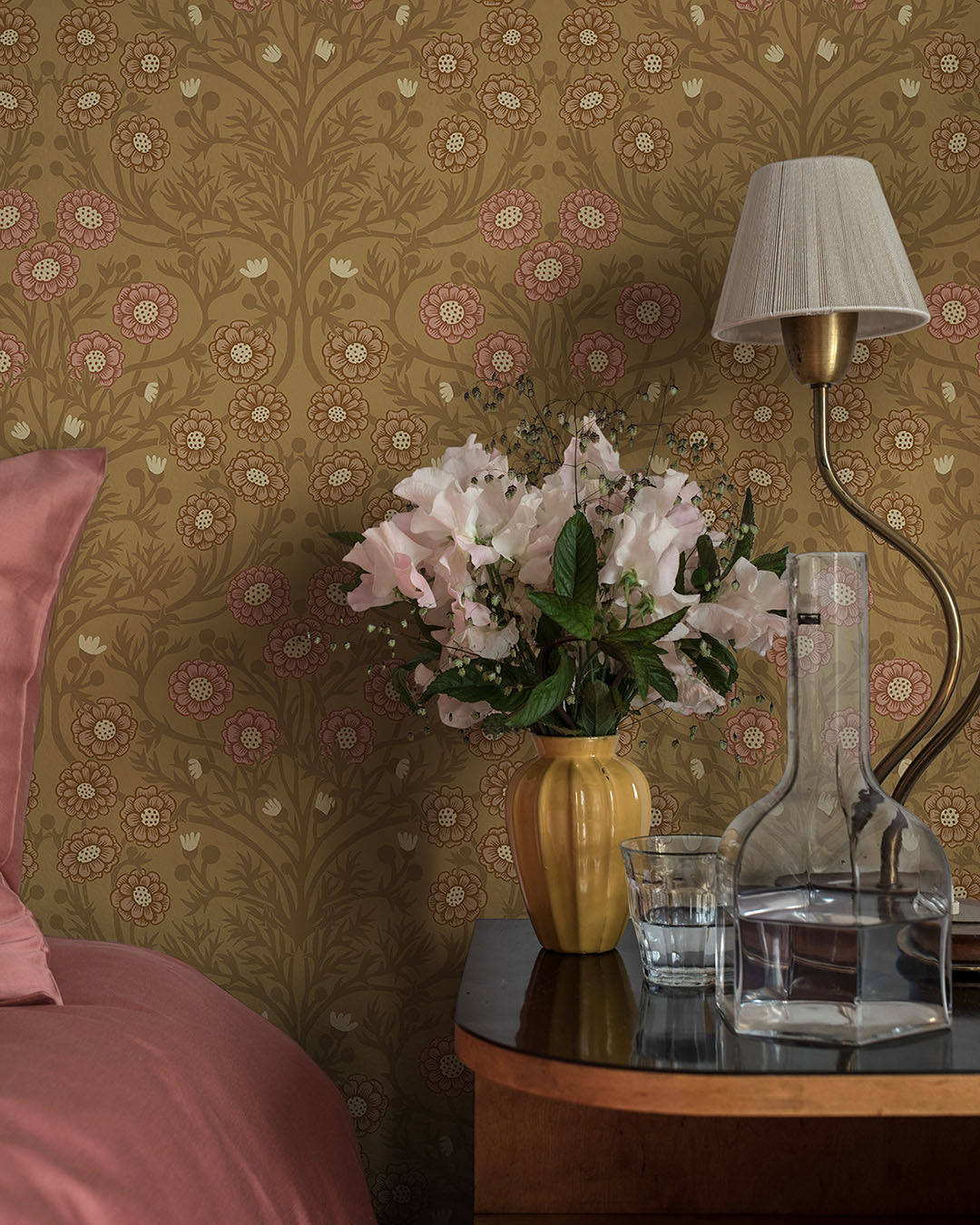 Bjud in en gammaldags charm till ditt hem med denna färggranna Hanna Wendelbo-design i mönstret Bellis. Upplev en ljusbrun tapet med varma undertoner som pryds av rosa blomster, där glädje kommer spridas i det rummet denna tapet har turen att hamna i.
