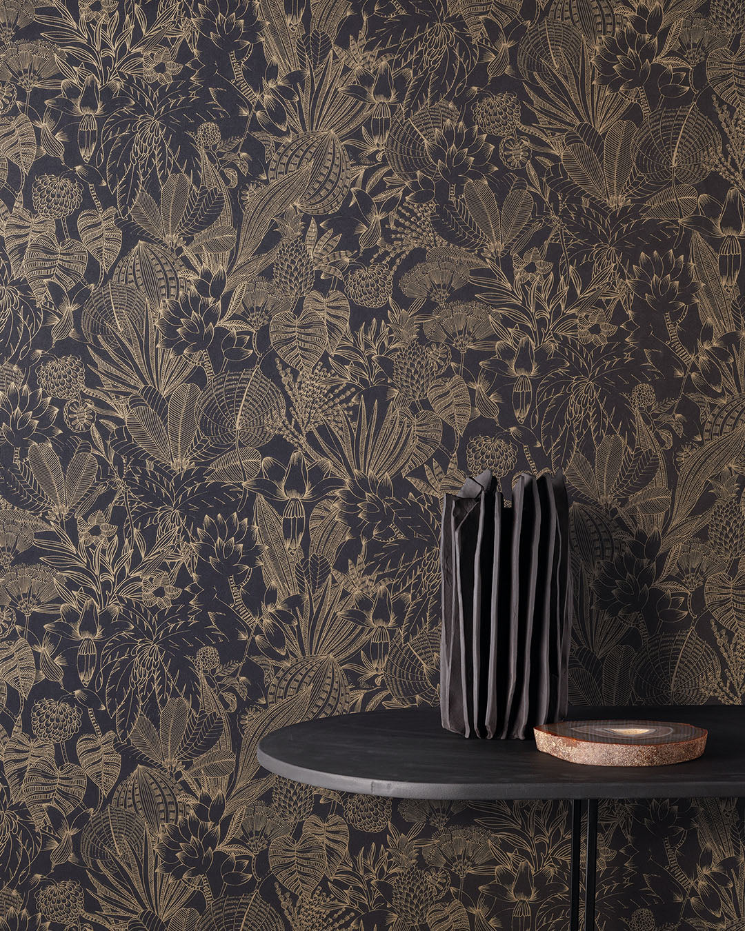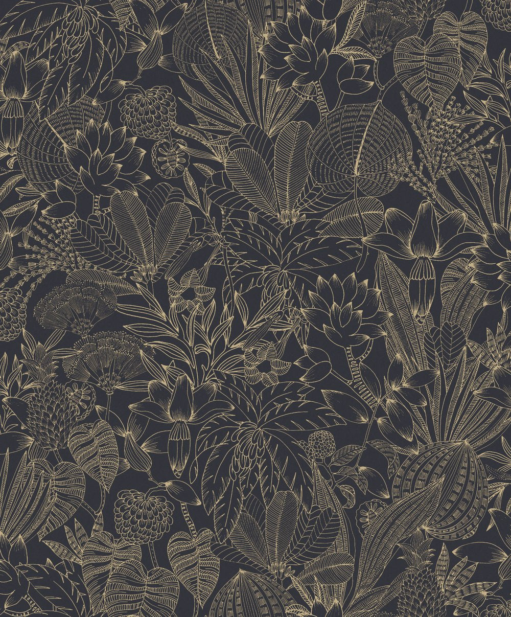 Tapeten Bellis Niagara för tankarna till en förtrollad nattlig trädgård. Mot en djup mörk botten breder ett intrikat mönster av gyllene blad och exotiska blommor ut sig, med en elegant glans som fångar ljuset på ett subtilt sätt. Det detaljerade linjemönstret skapar en lyxig och sofistikerad känsla, perfekt för dig som vill addera dramatik och elegans till hemmet.