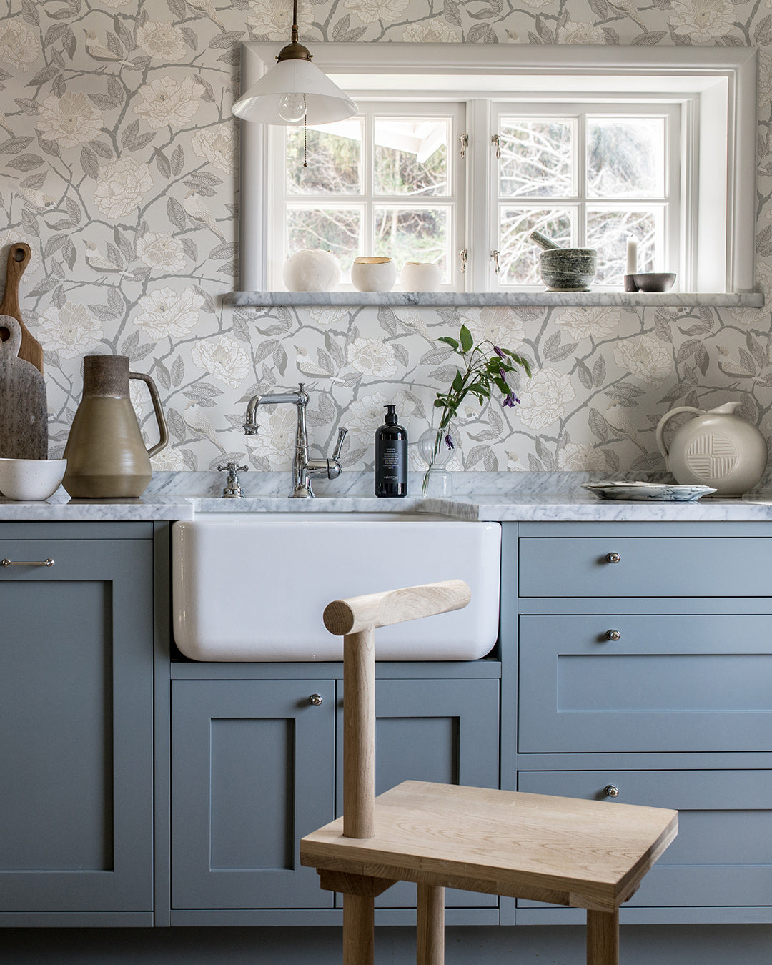 Förändra rummet och skapa en unik atmosfär med tapeten Bernadina. Se på detta storblommiga mönster av vackert utslagna blommor, i ett skirt bladverk bland kvittrande fåglar. En behaglig beige färgställning i lätta, mjuka nyanser harmoniserar fint tillsammans med krispigt vita snickeridetaljer.