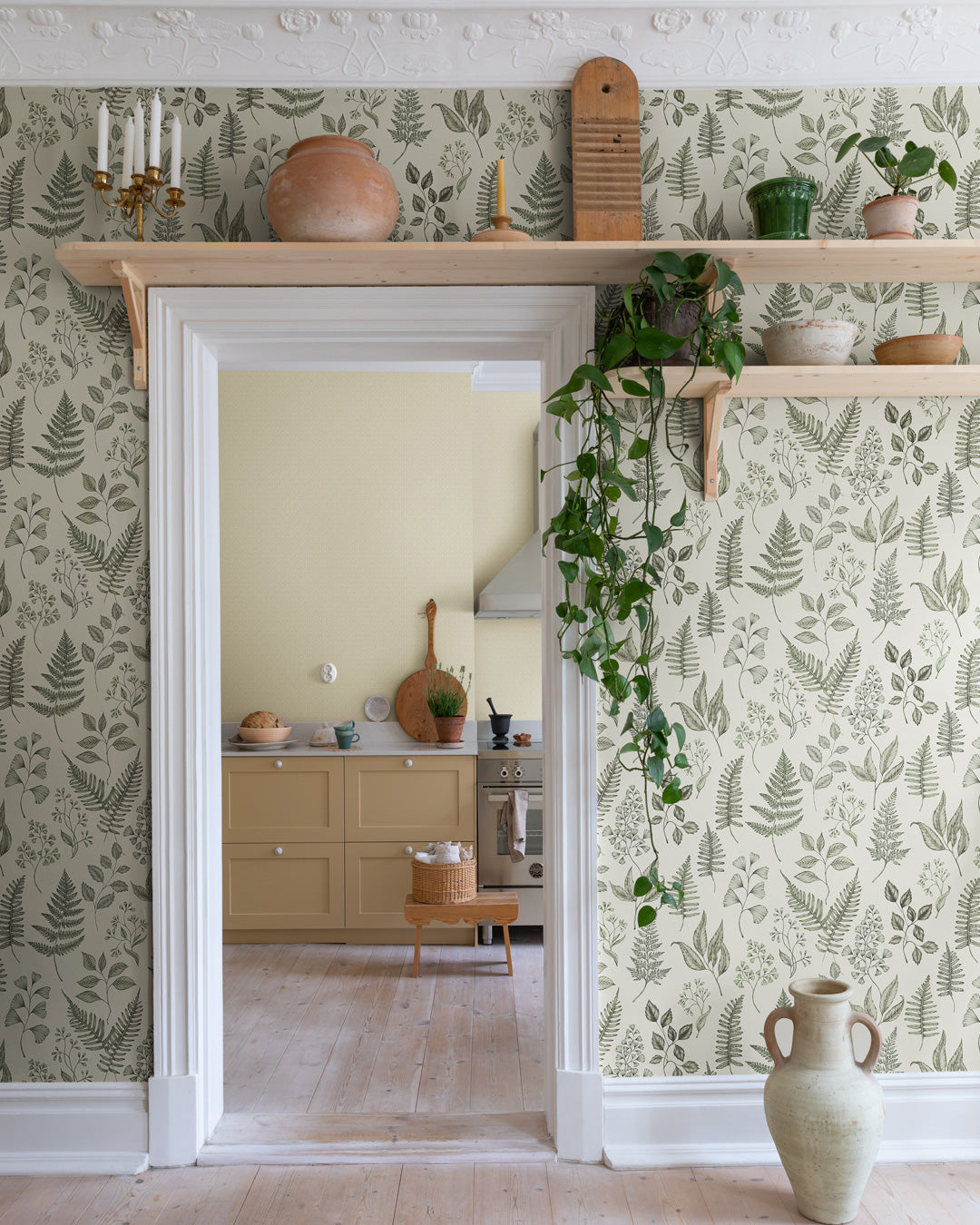 Gräddvit tapet med en salig mix av botanik som ger ett djup till ditt sovrum, kök eller arbetsrum. Designern Hanna Wendelbo har fångat skogens skönhet i ett mönster som ger en frisk och lantlig känsla till ditt hem. Mönstret Betula finns i 8 stilfulla nyanser.