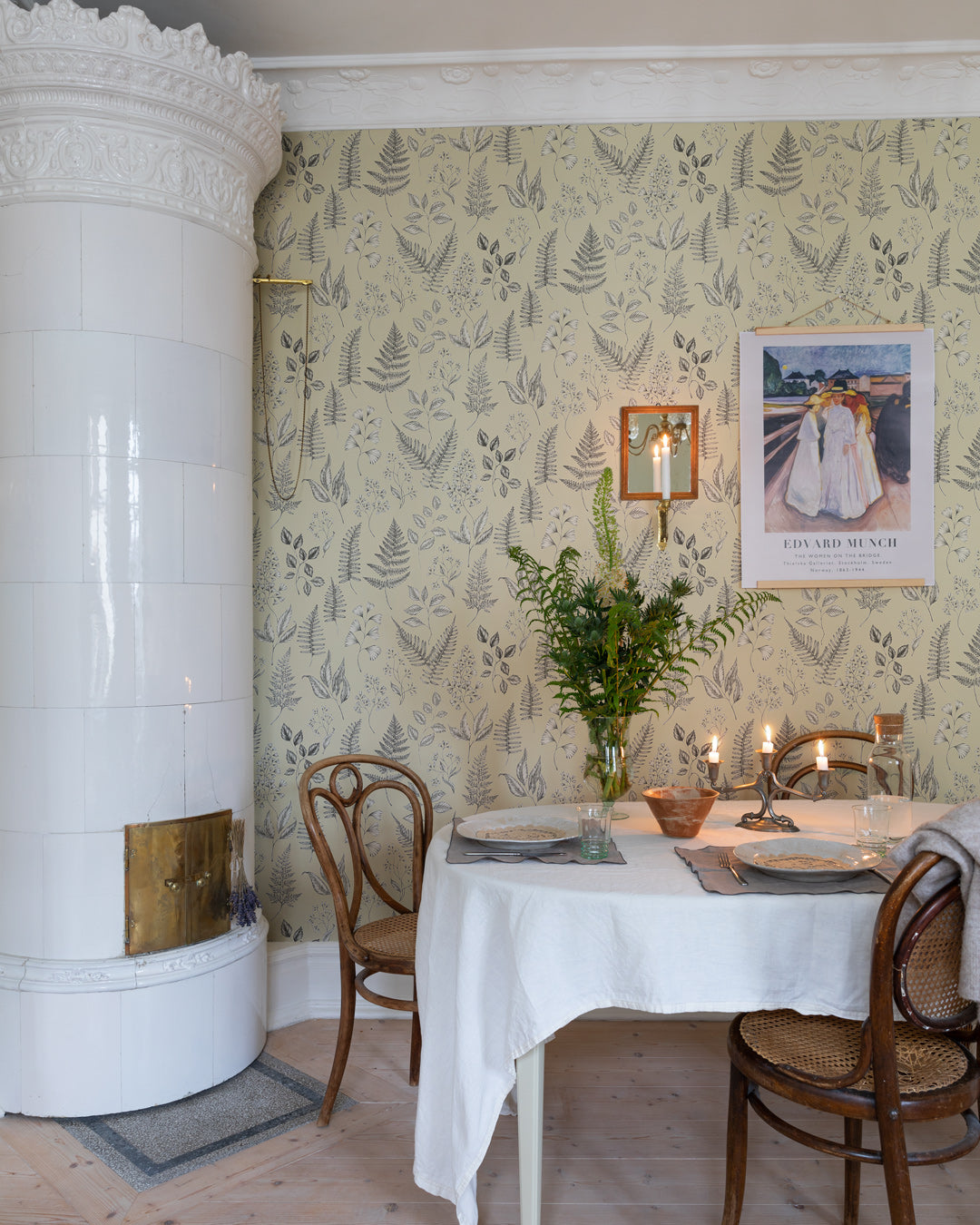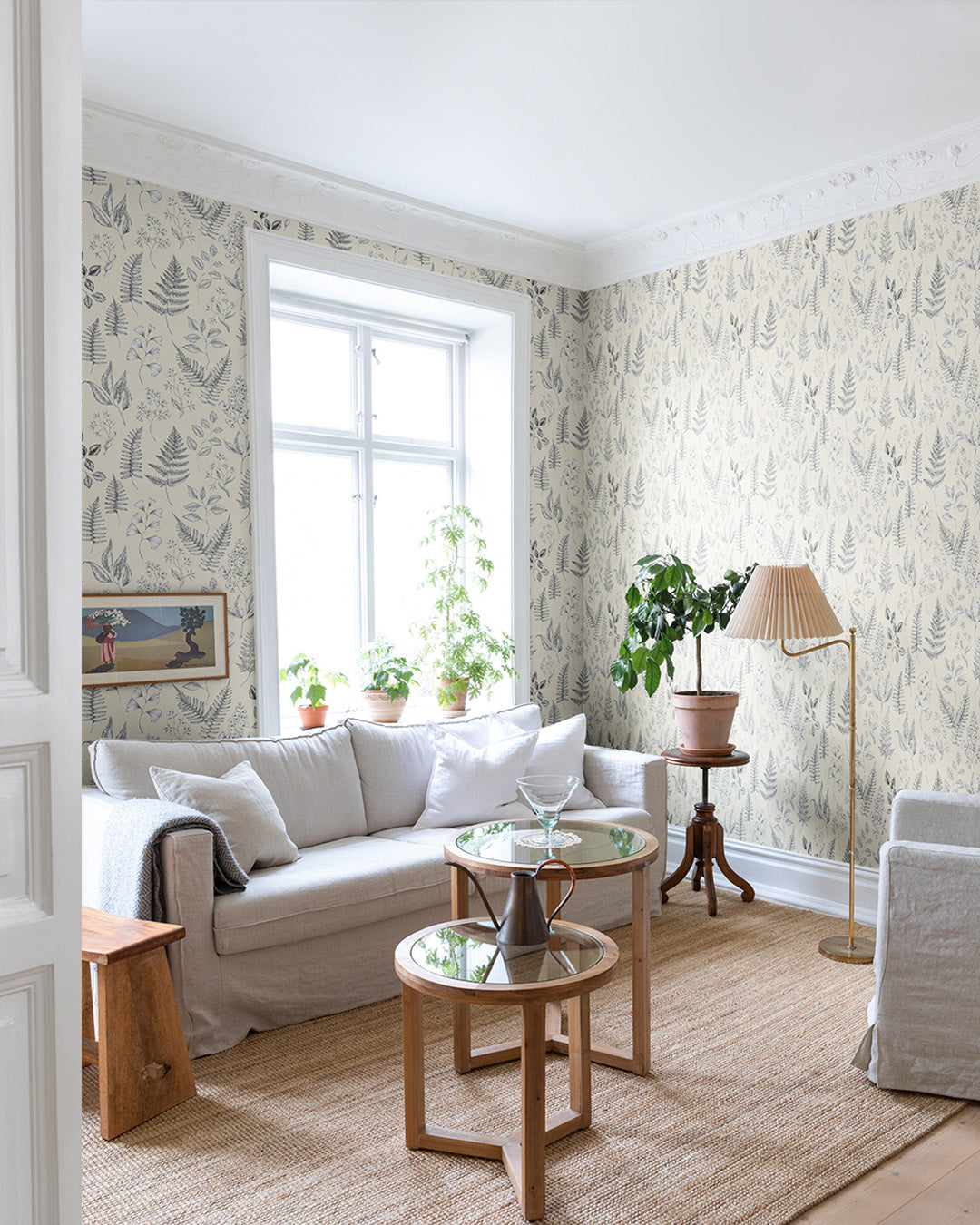 En pastellig dröm. Denna ljuvliga ljusgula tapet smyckas av handskissade växter i olika arter. Denna tapet är designad av duktiga Hanna Wendelbo och tillhör kollektionen Skogsgläntan. Hannas inspiration bakom denna förtrollande kollektion var det inre lugnet många av oss hittat i naturen under tider fylla av restriktioner.