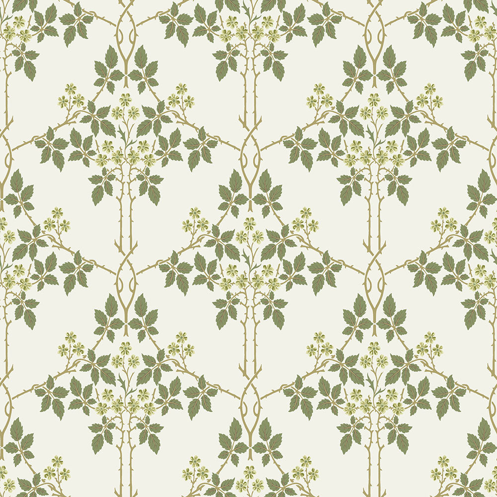 Tapeten Blackberry har ett minimalistiskt mönster i form av ett ordnat björnbärsnår som skapar vacker symetri på väggen. På en vit botten klättrar nätta bruna grenar med gröna blad och ljusgröna små björnbärsblommor. Ett luftigt mönster med mycket karaktär som ger hemmet en välkomnande känsla.