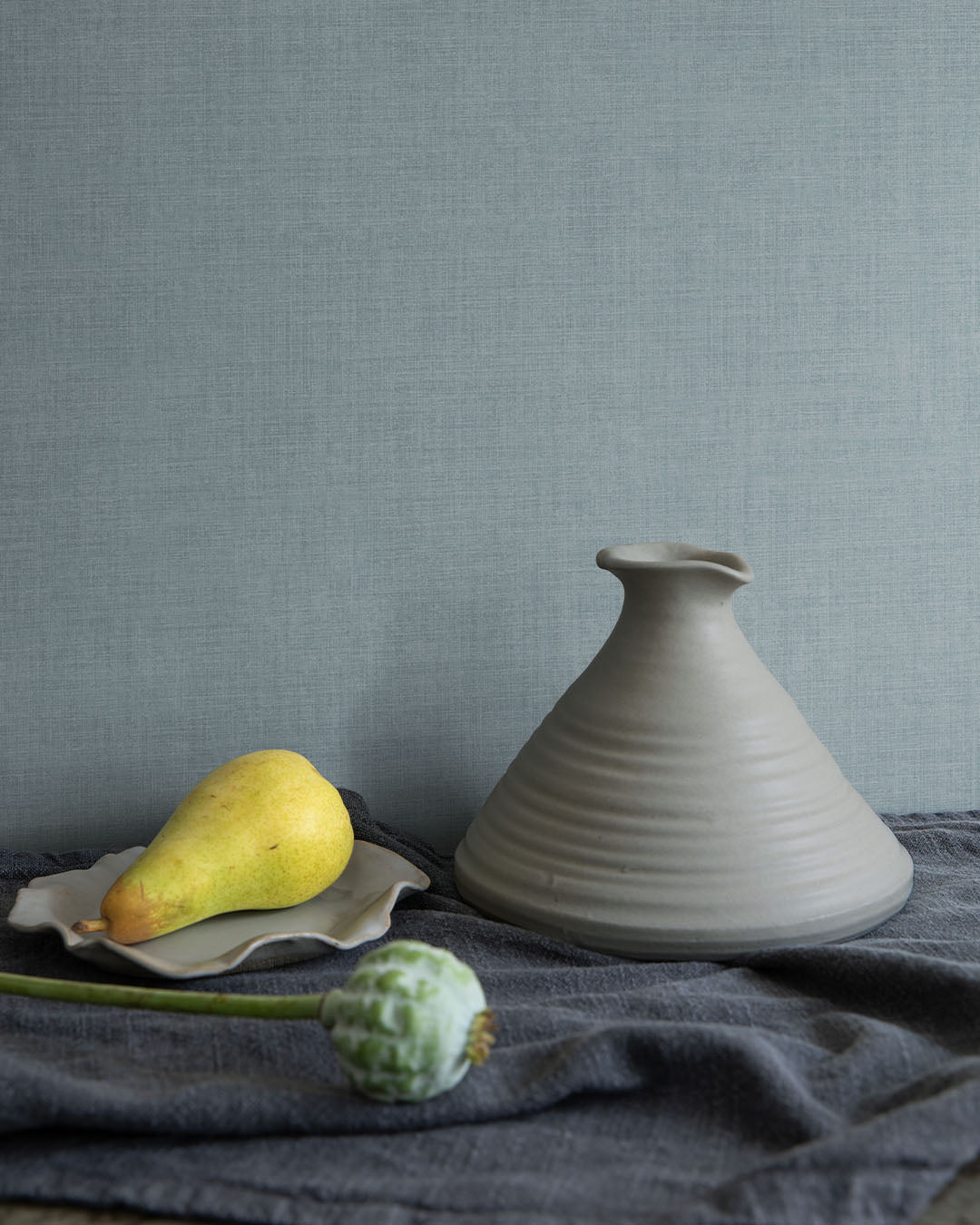 Enfärgad tapet Jute med lätt strukturerad yta och textila inslag som gör att hemmet upplevs mer ombonat. Denna färgställning går i en mörk blågrå ton och skiftar vackert i nyans utifrån hur ljuset faller längs med väggen.