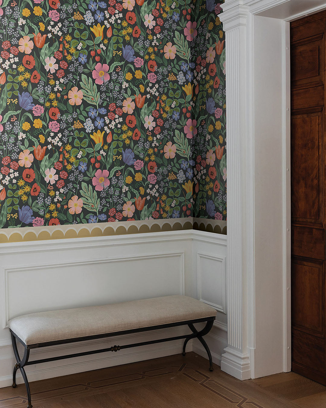 Tapet Blossom är en rik, heltäckande blomtapet med handmålade trädgårdsblommor i olika storlekar och stadier. Här samsas vallmo, rosor, tulpaner, ringblommor och förgätmigej med körsbär, insprängt bland stora, mjukt svängda blad och kvistar. Botten är svart och färgskalan är livfull i korall, puderrosa, vallmorött, gult, orange samt blått och bladverket går i olika gröna nyanser med tecknade ådringar. Helhetsintrycket är frodigt och ombonat med en lätt dramatisk känsla där den mörka bottnen ger djup och låter färgerna lysa, samtidigt som den handritade stilen gör mönstret varmt och inbjudande.