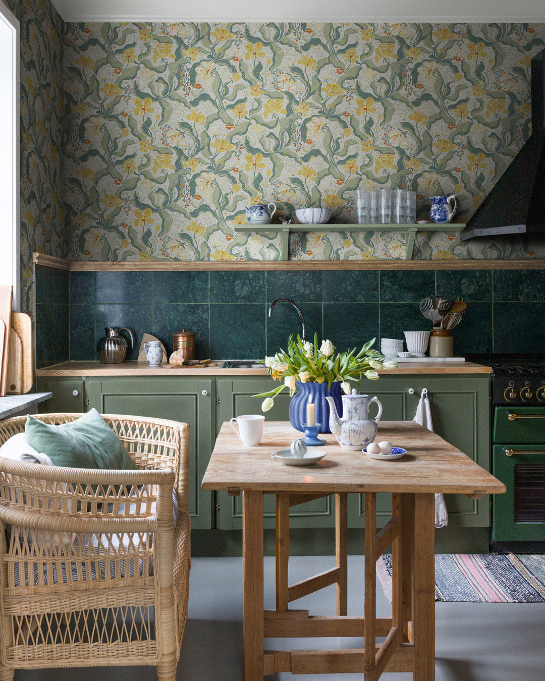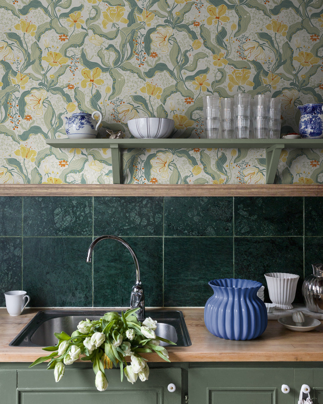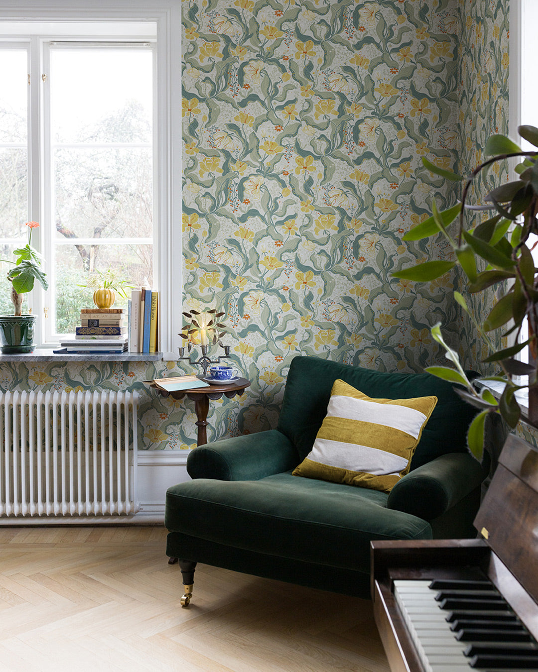 Bodri med sin gula touch fyller rummet genast med energi. Som solens strålar försiktigt silas genom bladverket skapas en känsla av upprymdhet och hopp. Tapeten är skapad av Lina Schnaufer som gärna skapar mönster med en person i åtanke. Vad hade denna person varit tolkad i ett mönster? Bodri finns totalt i sex fantastiska färgställningar.