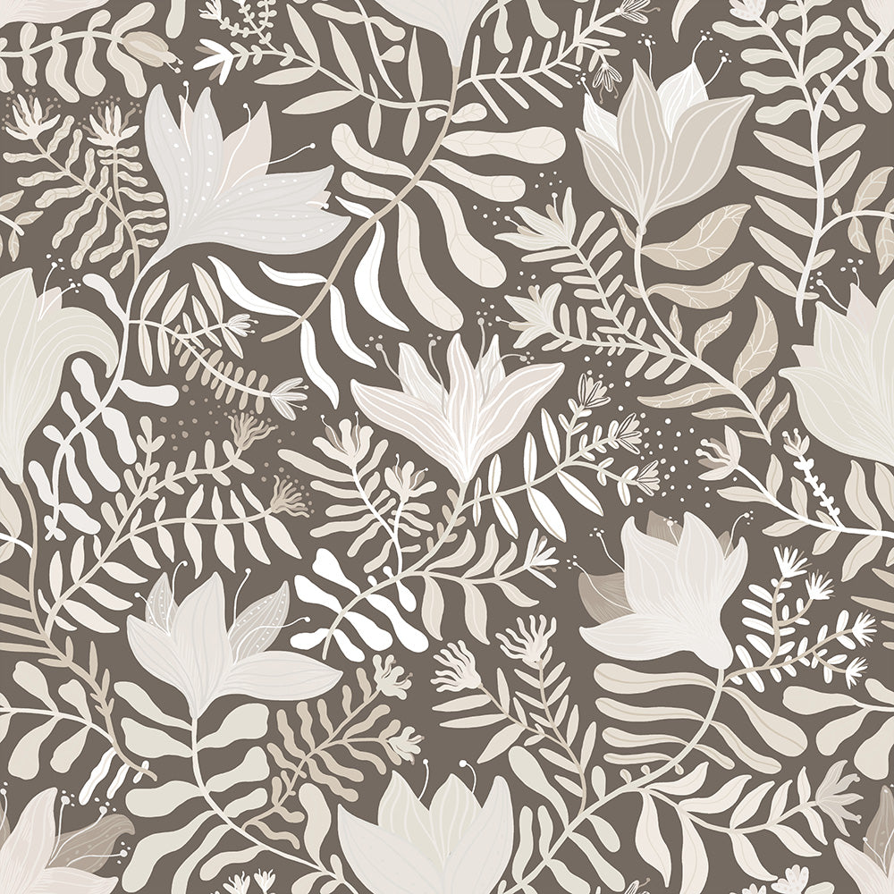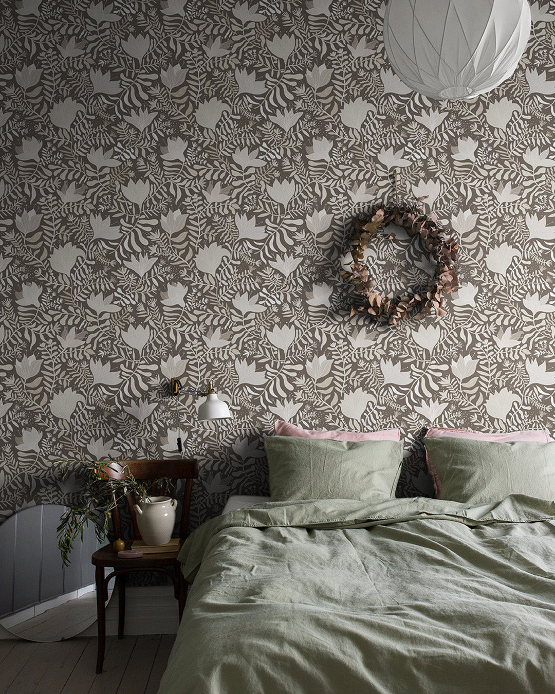 Vit stormönstrad blomma mot en grå bottenfärg, en tapet som gör sig lika bra i den moderna etagevåningen i stan som i stugan ute på landet. När designern Lina Schnaufer designade detta mönstret utgick hon från mönstret "Brittsommar", som bygger på hennes favoritmotiv från en rörstrandstallrik.