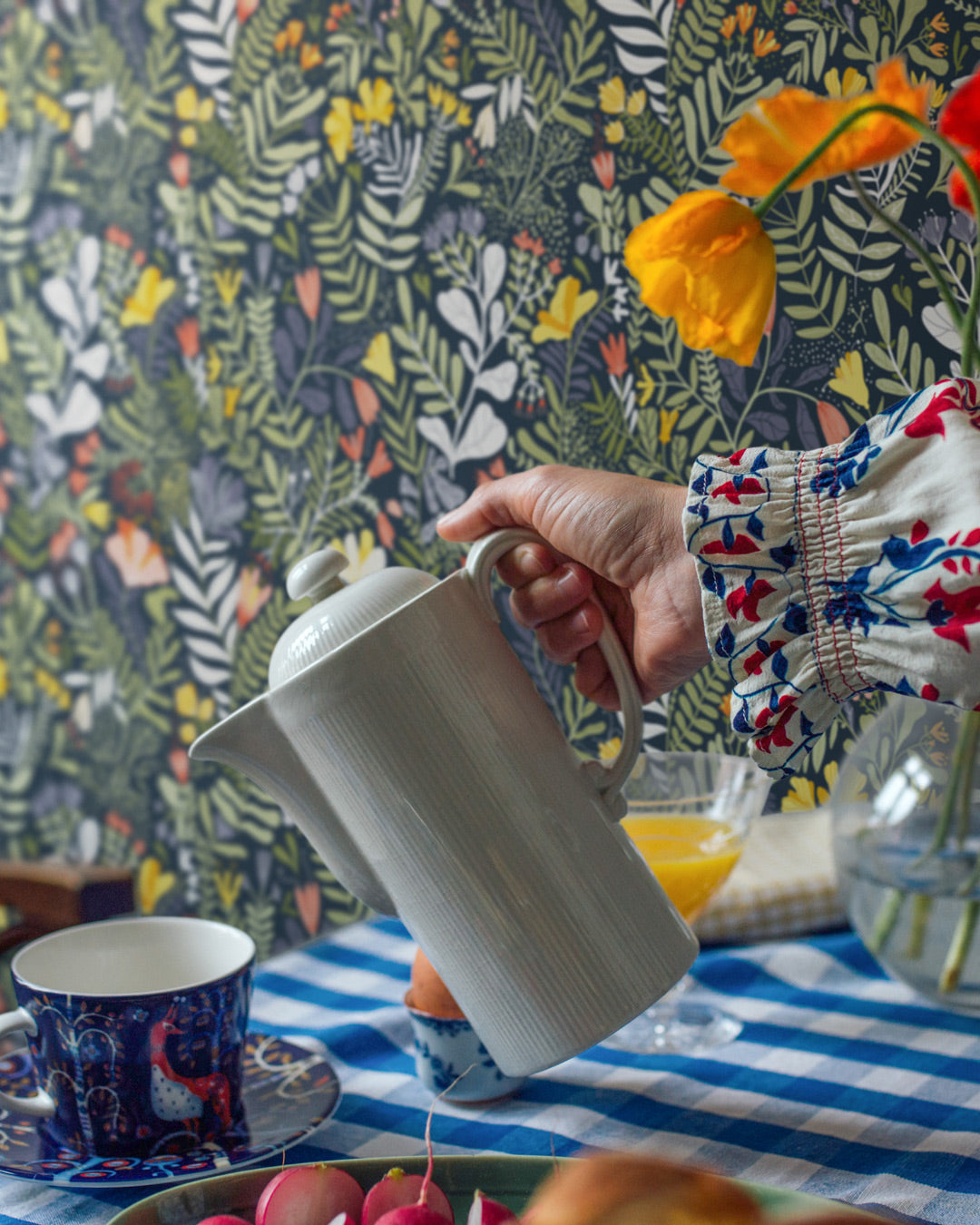 När du tänker på en sprudlande och färgglad tapet så hoppas vi att du ser "Brittsommar" framför dig. Ett enastående mönster som är ett konstverk i sig självt. Den saliga kompotten med blågrå, grön, vit, rosa, rött och gult harmoniserar på ett lekfullt sätt mot en mörkblå (nästan svart) bottenfärg och ger väggarna liv.