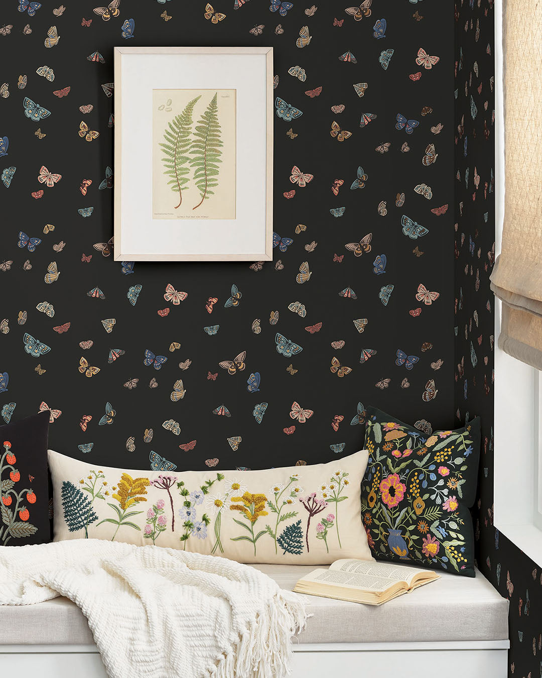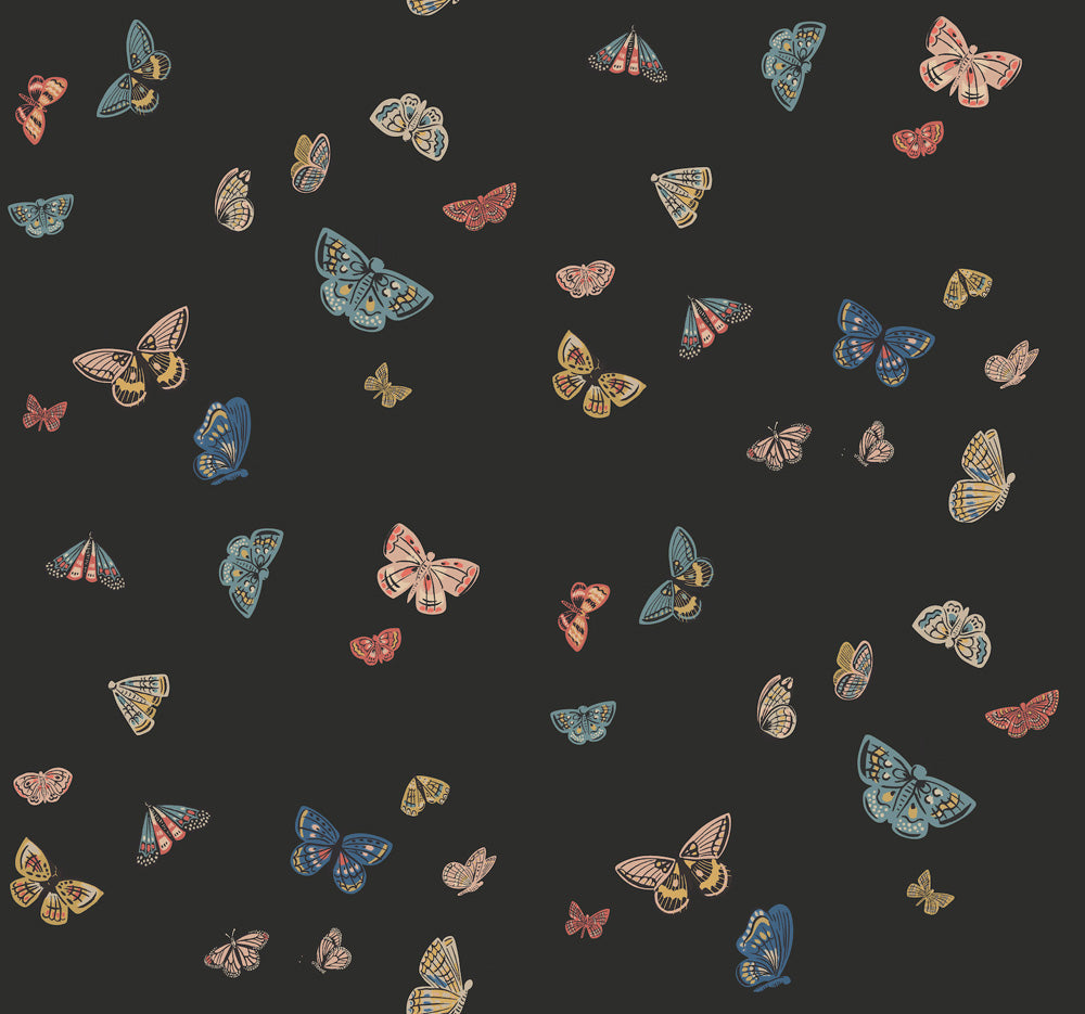 Tapet Butterfly House är en luftig tapet med handritade fjärilar och nattfjärilar i olika storlekar som svävar över ytan i mjuka rörelser. Botten är djup svart och fjärilarna är färgsatta i klara accenter som blått, grönt, puderrosa, rött och guldmetallic. Helhetsintrycket är elegant och stämningsfullt med lätt dramatik där den svarta bottnen ger djup och låter färgerna lysa, samtidigt som det luftiga avståndet mellan motiven gör mönstret lätt och modernt.
