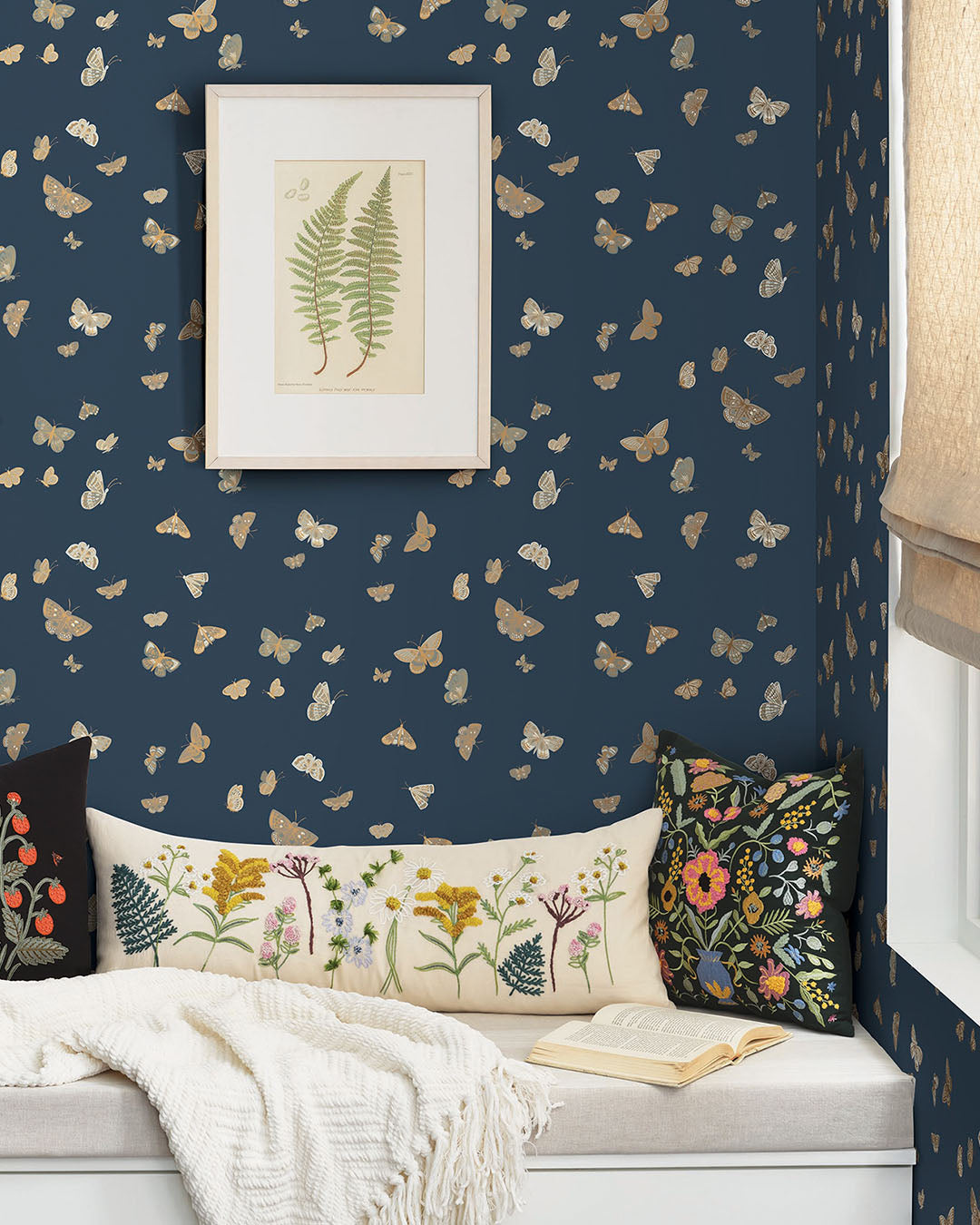 Tapet Butterfly House är en luftig tapet med handritade fjärilar och nattfjärilar i olika storlekar som svävar över ytan i mjuka rörelser. Botten är djup midnattsblå och fjärilarna är färgsatta i neutrala toner som ljusgrått, dimblått, vitt och guldmetallic. Helhetsintrycket är ombonat och mjukt där den mörka botten ger djup och ro medan de varma, gyllene nyanserna adderar elegant lyster utan att ta över.