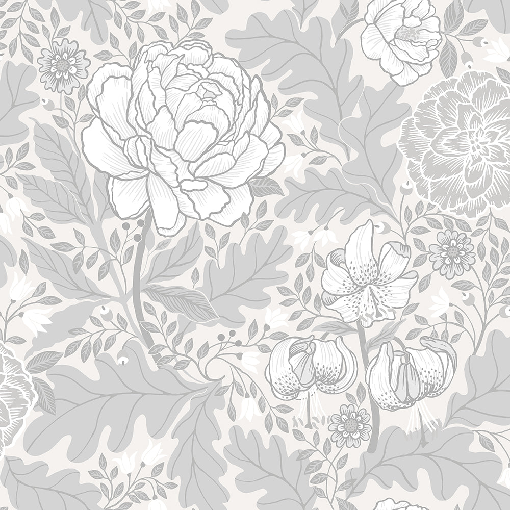 Klassisk vit storblommig tapet som omfamnas av en blandning av gråa blad. Denna neutrala tapet ger dig stor flexibilitet med din inredning, fyll på med sprudlande färger eller håll dig till en minimalistisk och modern färgpalett. Mönstret vi ser på bilden heter Camille och kommer i 5 färger.