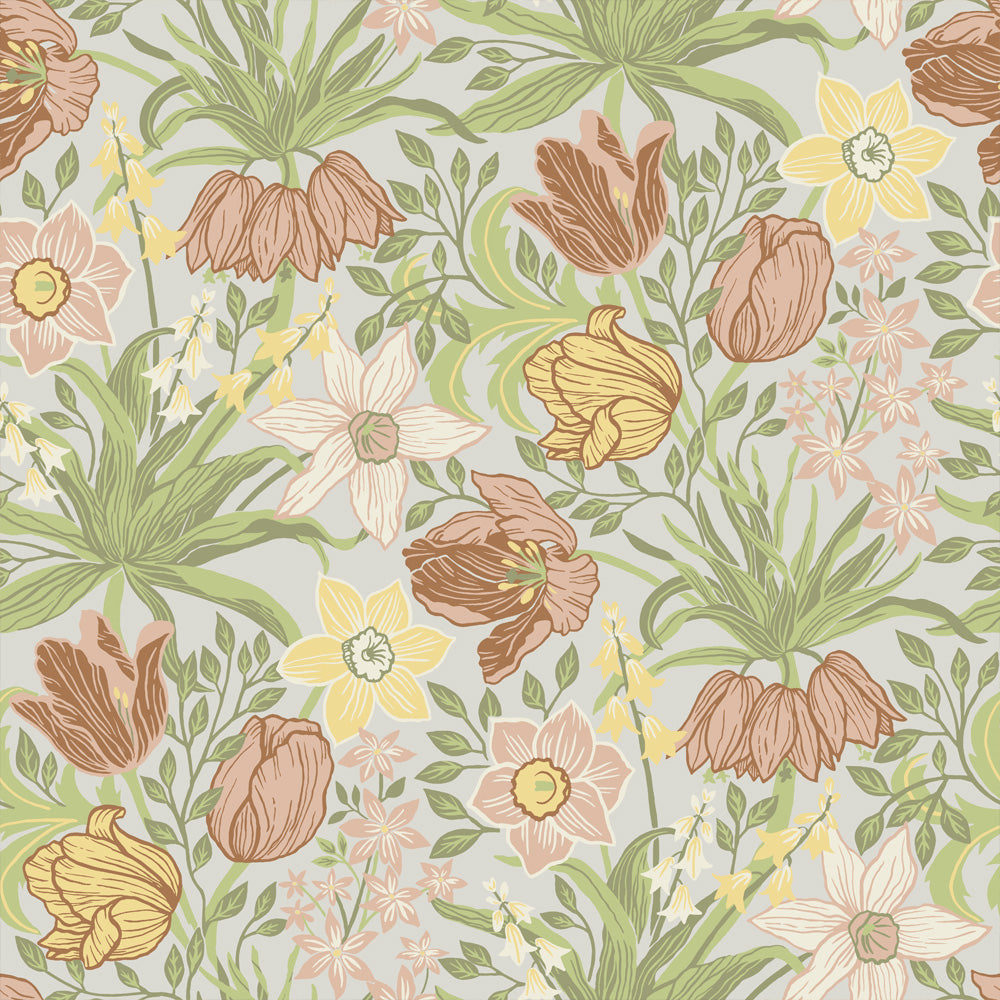 Ljuvligt blomsterhav av de vackraste tulpaner och narcisser, lätt dansande i skenet av Kejsarkronans majestätiska uttryck. Den täta mönsterbilden av mjuka, behagliga nyanser i blekt gul, pudrigt rosa och ljusgrönt skapar en ombonad och levande atmosfär i hemmet.