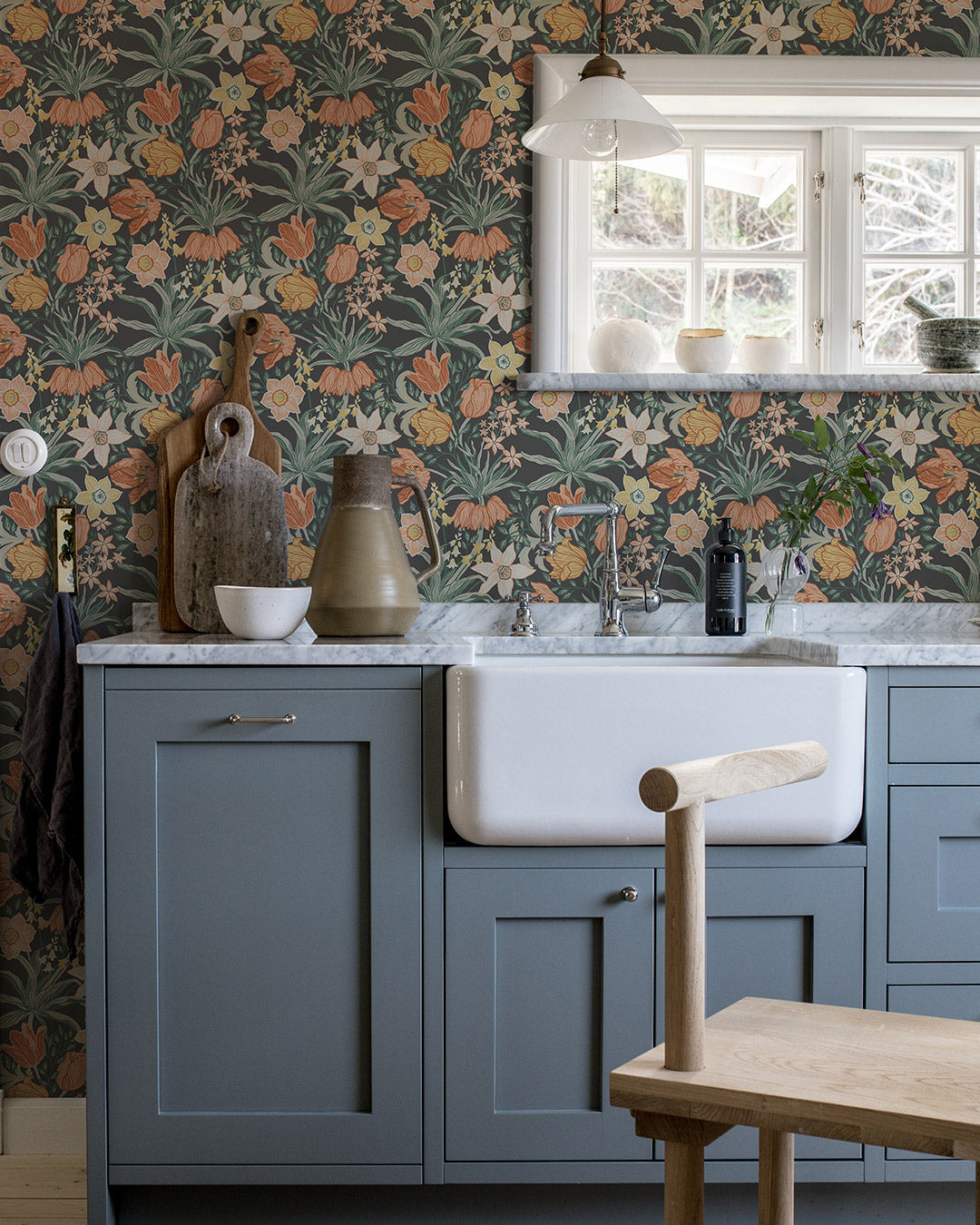 Livligt och uttrycksfullt i ett blomsterhav av tulpaner och narcisser. Lätt dansande i skenet av kejsarkronans marestätiska uttryck. Tapeten Cecilia med sitt täta mönster av blommor i dämpade gula och orange-rosa nyanser mot en botten med viss svärta ger rummet ett dramatiskt och elegant uttryck.