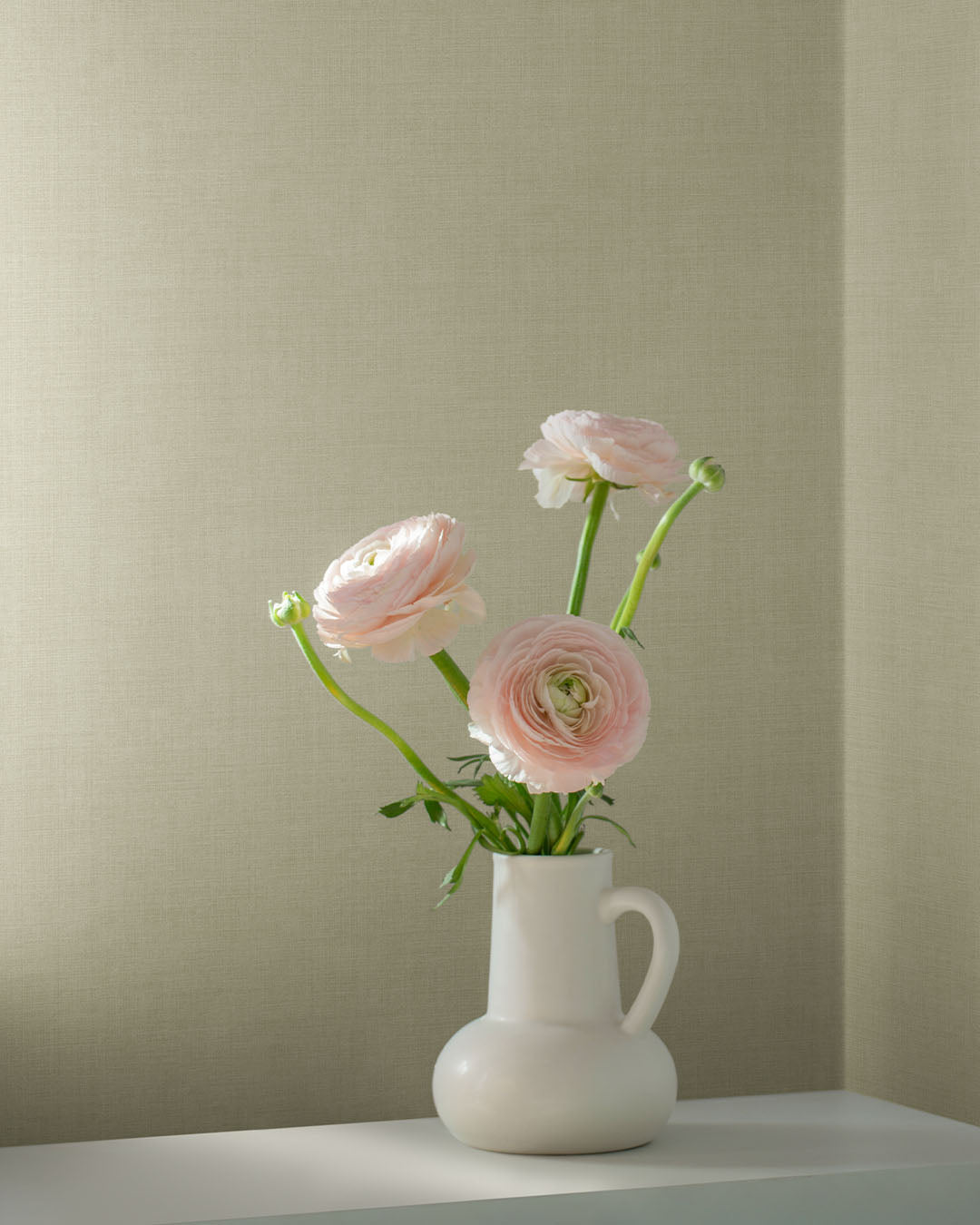 Den enfärgade tapeten Jute kommer i flera behagliga färgställningar och här i en beige nyans. Dess textilliknande yta med lätt strukture gör den lika fin på egen hand som kombinerad med de mönstrade tapeterna och bårderna i kollektionen Sommaräng.