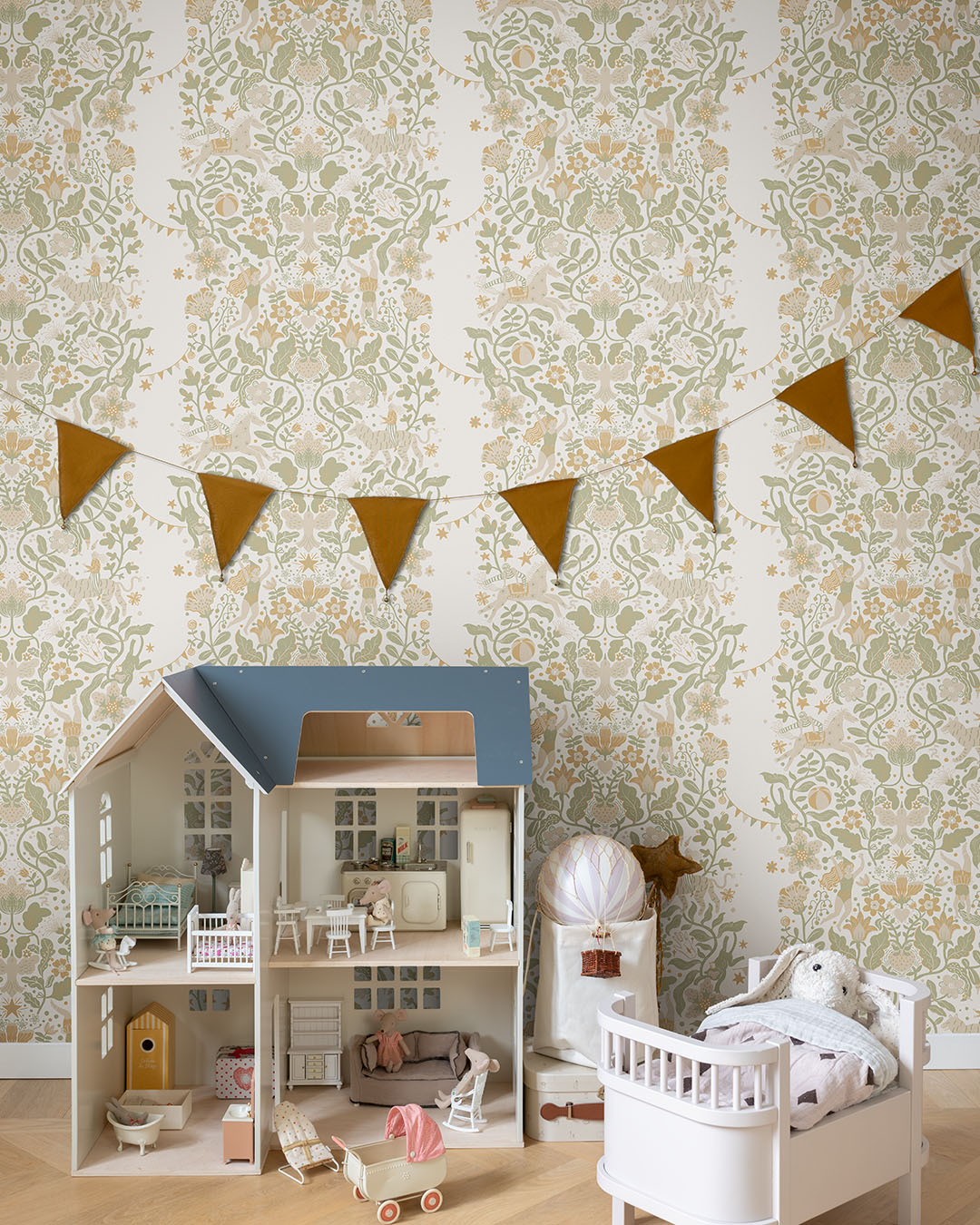 Ballonger, popcorn och förväntningar. En cirkus är i stan! På en vit botten i barntapeten Cirkus ser vi akrobater, blommor och djur i nyanser av olivgrönt, beige och ockra. Det är svårt att se sig mätt på alla skojiga detaljer och ju mer du tittar dessto mer kommer du att upptäcka i denna fantastiska cirkusvärld.