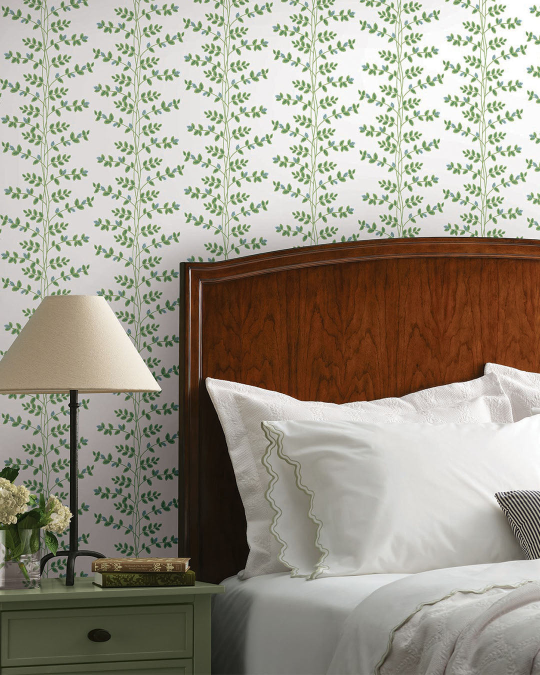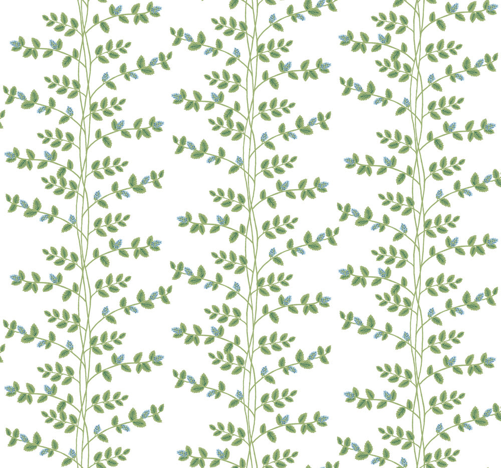 Tapeten Climbing Vine har ett luftigt, upprepande mönster med smala, klättrande stjälkar som löper lodrätt och förgrenar sig i mjuka bågar. Längs rankorna sitter små, ovala blad i flera gröna nyanser med diskret textur som ger en handritad känsla. Mellan bladen syns små klasar av ljusblå blommor som prickar av mönstret. Botten är klar vit, vilket gör helheten ljus och ren. Det vertikala flödet skapar ett diskret randigt uttryck som känns friskt, lätt och naturligt.