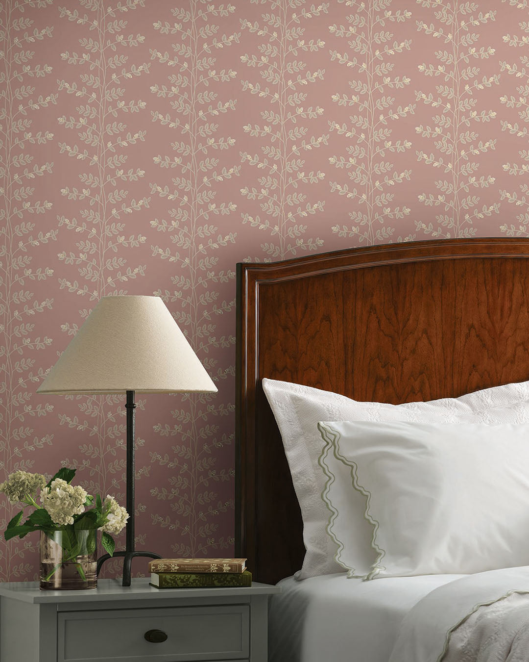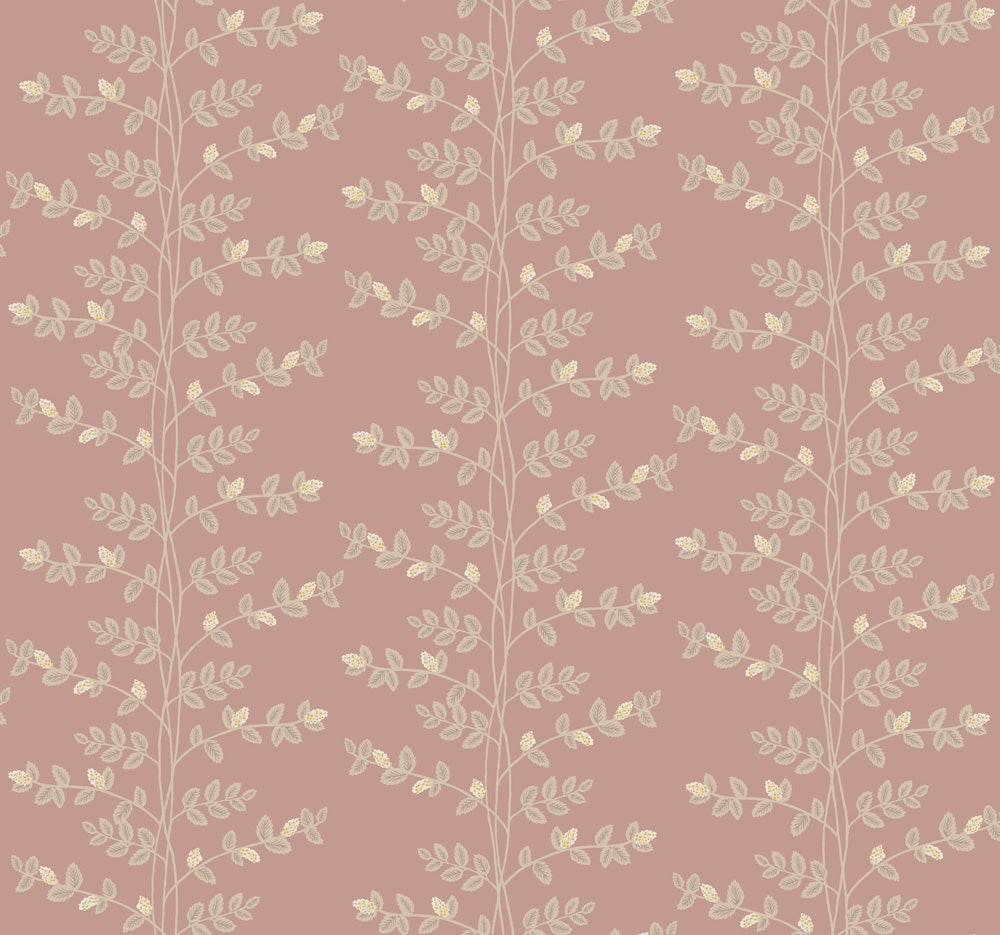 Tapeten Climbing Vine har ett luftigt, upprepande mönster med smala, klättrande stjälkar som löper lodrätt och förgrenar sig i mjuka bågar. Längs rankorna sitter små, ovala blad i puderrosa nyanser med diskret textur som ger en handritad känsla. Mellan bladen syns små klasar av vita blommor med guldprickar. Botten är mjukt gammelrosa vilket ger en varm och ombonad känsla. Det vertikala flödet skapar ett diskret randigt uttryck som känns friskt, lätt och naturligt.