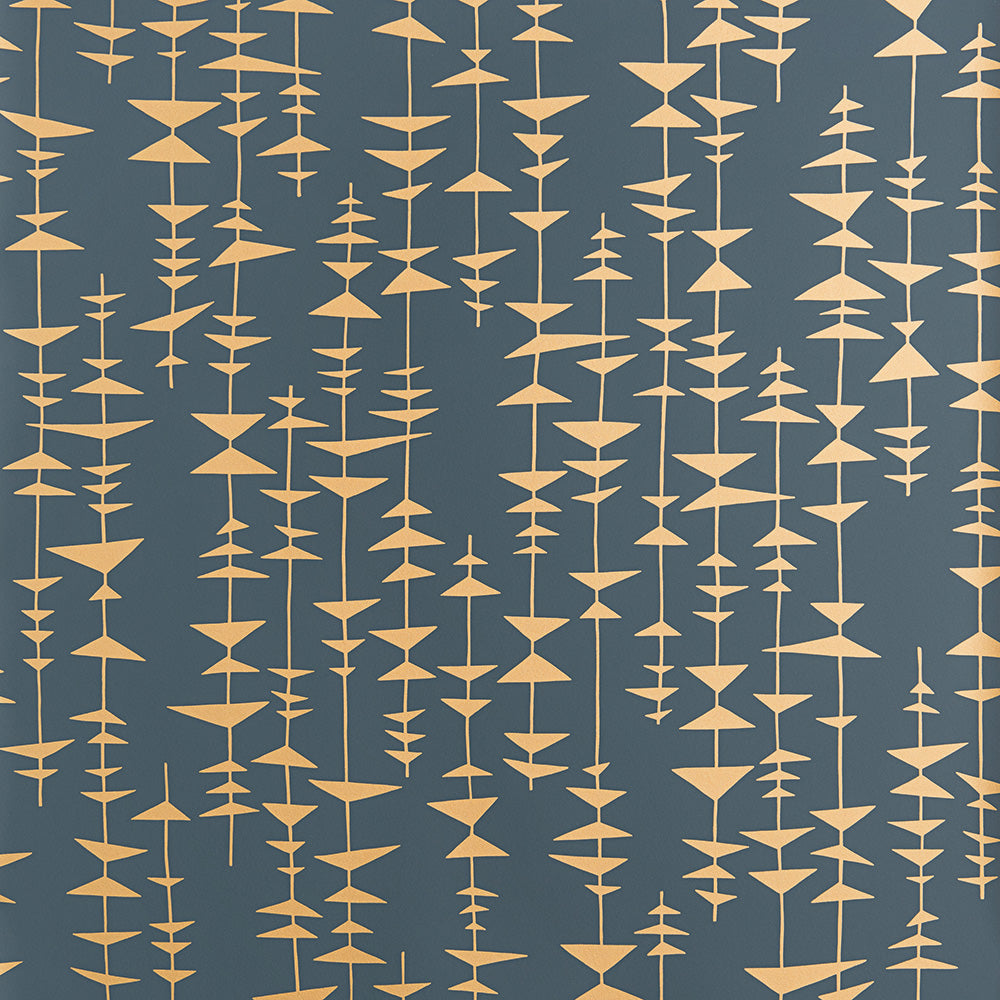 Matt mörkblå tapet på gränsen till svart fylls av handmålade trianglar i reflekterande guld som tillför en modern touch. Denna moderna geometriska tapet kommer vara ljuvlig när ljuset faller på väggen, då kommer väggarna sjunga med hjälp av solens strålar. FSC-certifierad