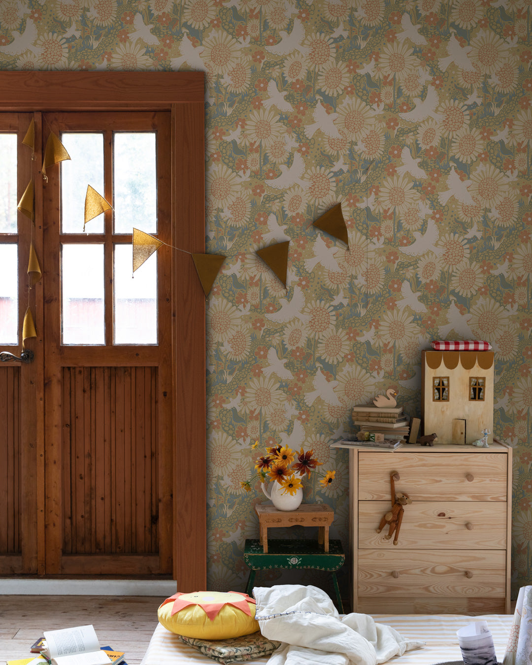 Med barntapet Drömma i färgställningen havre skapas ett glatt och spralligt barnrum. Likt solens strålar lyser denna gula nyans upp rummet och kompletteras fint med de andra kulörerna av blått, olivgrönt och rost. De söta fåglarna och de lekfulla blommorna ger en drömsk känsla i barnets fantastiska värld.