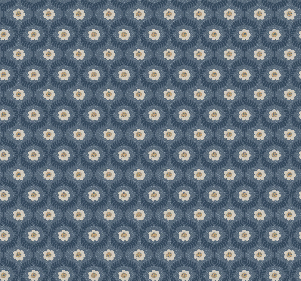 Tapet Emma är en blomtapet med regelbundna små medaljonger av blad där en enkel blomma ligger i mitten av varje cirkel. Det täta, jämna repetetionen ger ett fint intryck. Botten är denimblå med diskret prickstruktur. Bladkransarna är mörkt blå och mittblommorna är vita med en mitt i gulmetallic. Helhetsintrycket är lugnt och ombonat med klassisk, lite allmogeinspirerad känsla. Den blå färgskalan ger sval harmoni medan de varma blomcentrumen tillför mjuk livlighet vilket gör tapeten lätt att använda på stora ytor utan att ta över.