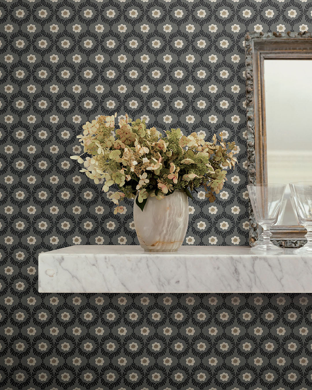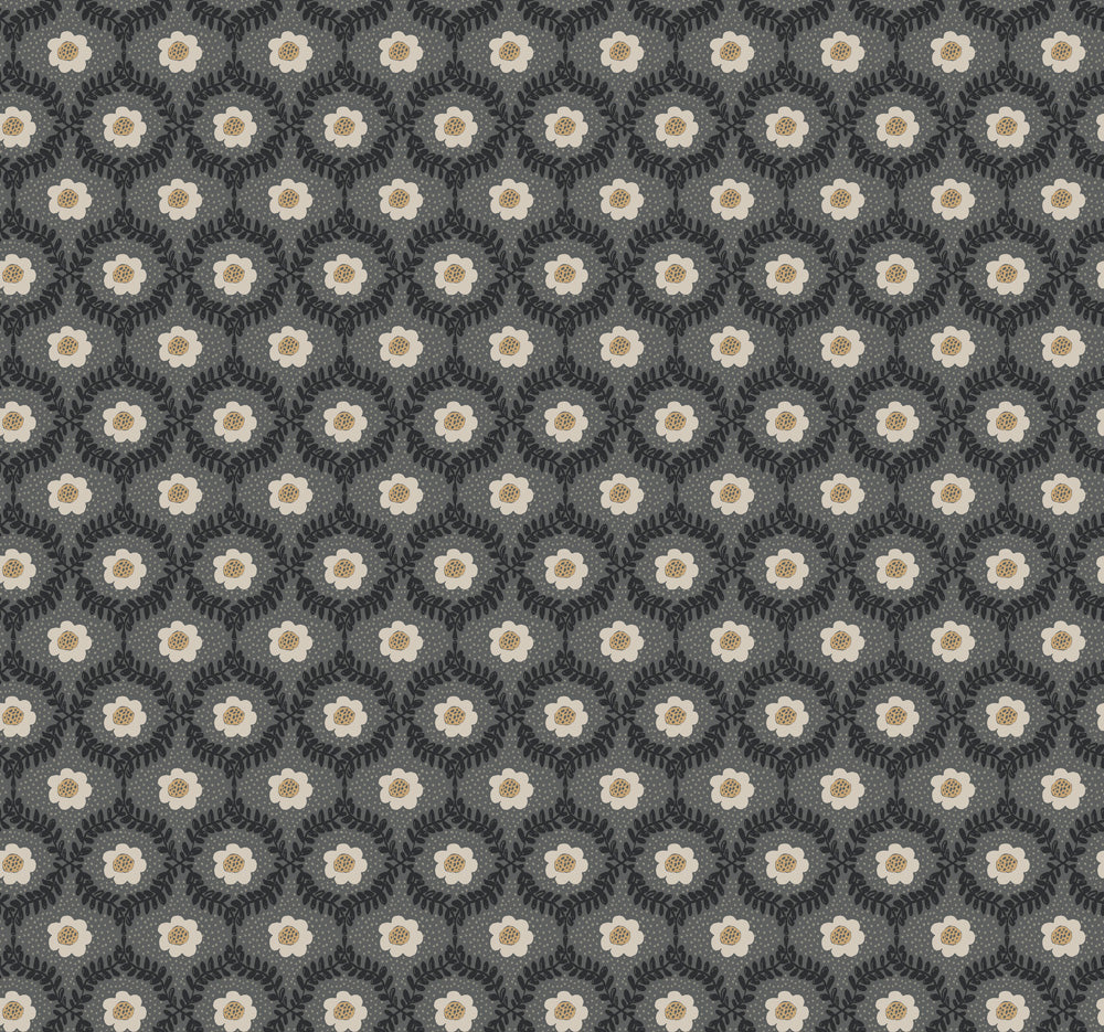 Tapet Emma är en blomtapet med regelbundna små medaljonger av blad där en enkel blomma ligger i mitten av varje cirkel. Den täta, jämna repetetionen ger ett fint intryck. Botten är skiffergrå med diskret prickstruktur i ljusgrått. Bladkransarna är mörkgrå och mittblommorna är vita med mittpartier i guldmetallic. Helhetsintrycket är ombonat och klassiskt med tydlig grafisk kontrast och en lätt dramatisk känsla. Den neutralt grå bottnen ger lugn och bär upp mönstret, medan de varma blomcentrumen tillför mjuk livlighet.