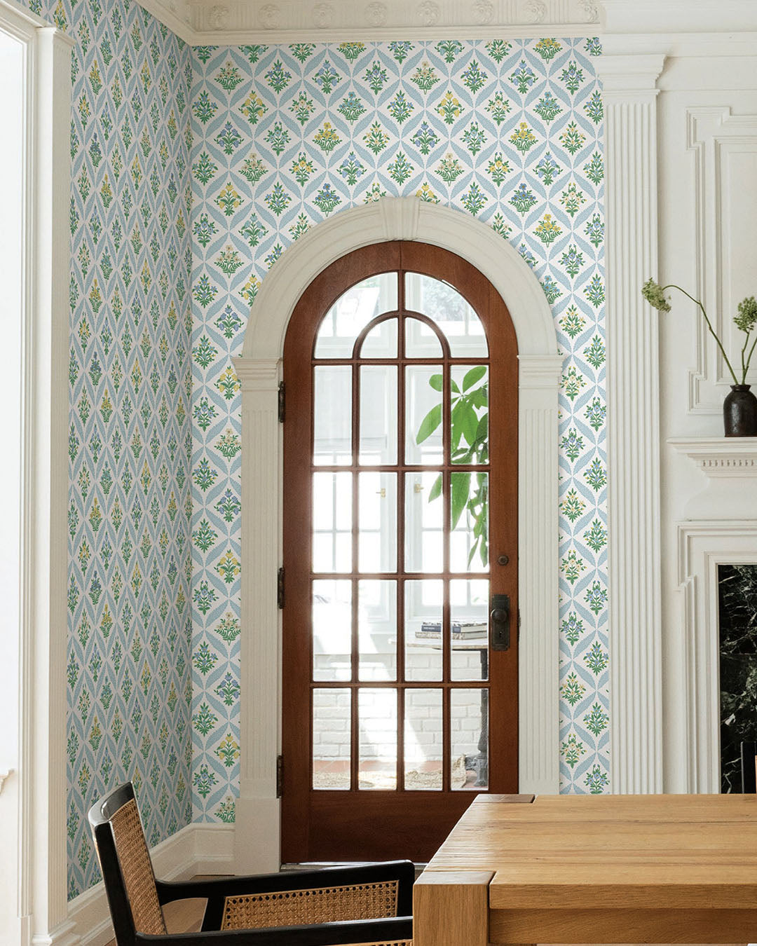Tapet Estee Garden är en småmönstrad, regelbunden tapet där rombformade kransar av blad ramar in olika blommor. Varje fält rymmer en egen liten bukett vilket skapar ett livfullt men ordnat uttryck med lätt folkloristisk känsla. Botten är vit och kransarna går i pudrigt ljusblått. Buketterna är färgsatta i mjuka toner av smörgult, beige, himmelsblått med gröna blad. Helhetsintrycket är ljust och svalt med tydlig rytm som ger ordning.