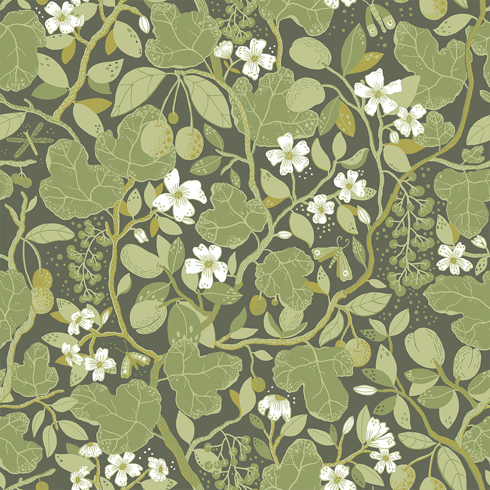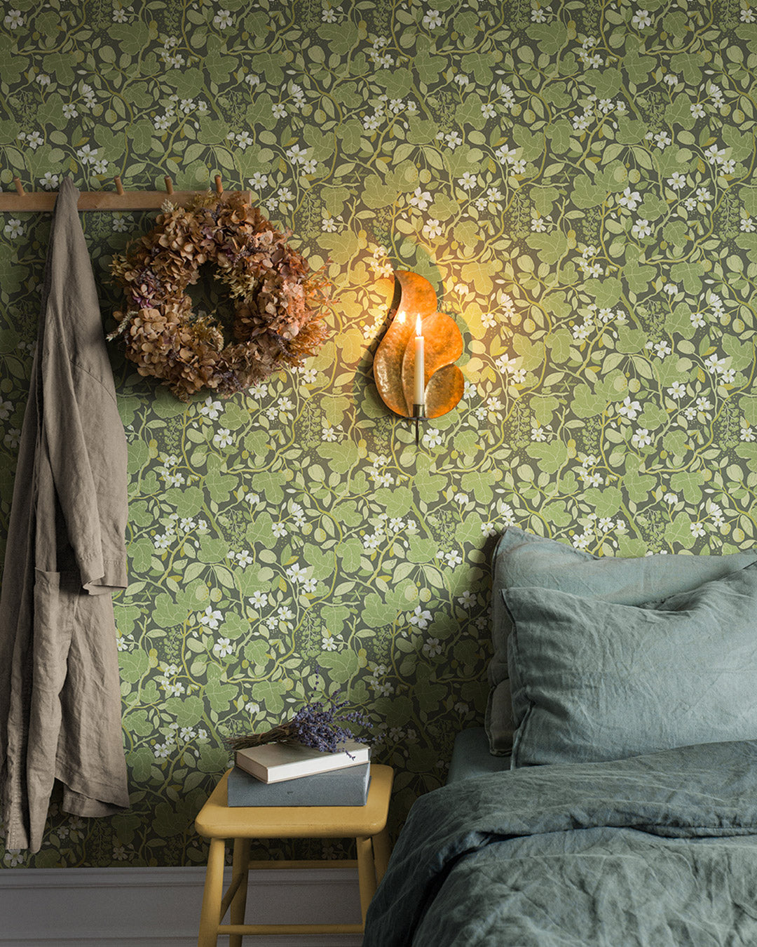 Tapeten Ewald är en ren och skär sommardröm! Skapat av Lina Schnaufer. Den gröna tapeten ger ett vackert lyster som förgyller tillvaron och förvandlar vilket rum som helst till en ren och skär sommaridyll. Ewald finns i fem olika färgställningar, denna går i olika nyanser av grönt och vitt.