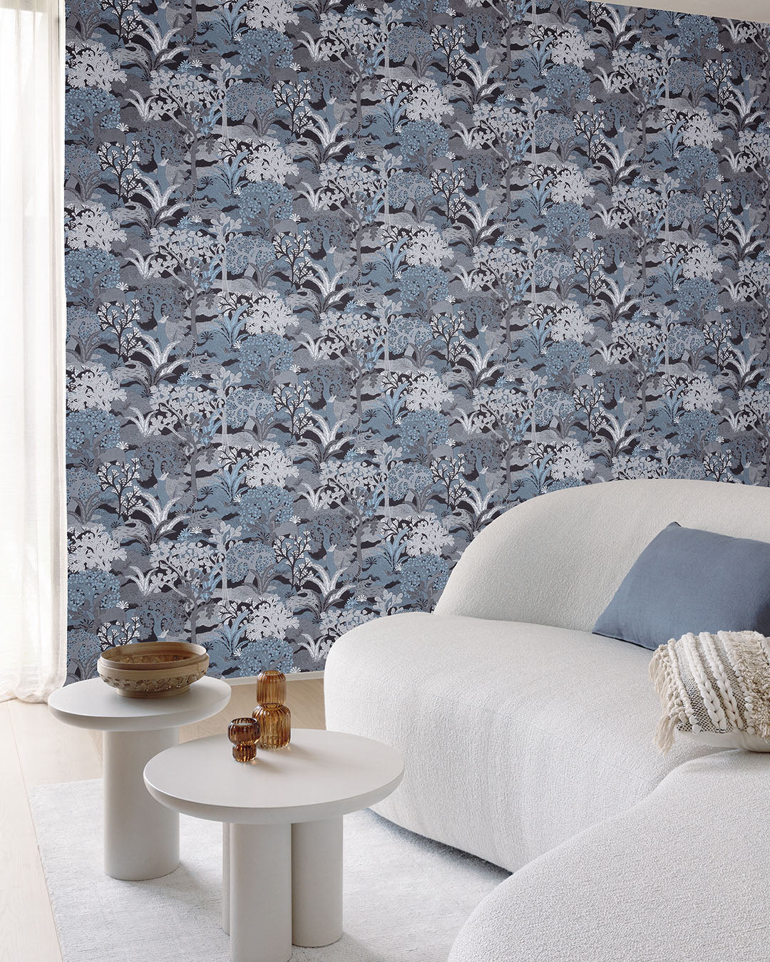 För in en känsla av djup och mystik med tapeten Fabulo Inkling. Ett konstnärligt mönster som fångar naturen i nyanser av blått, grått, vitt och svart. Tapeten skildrar ett sagolikt skogslandskap med träd, djur och subtil växtlighet i ett intrikat, textilliknande utförande.