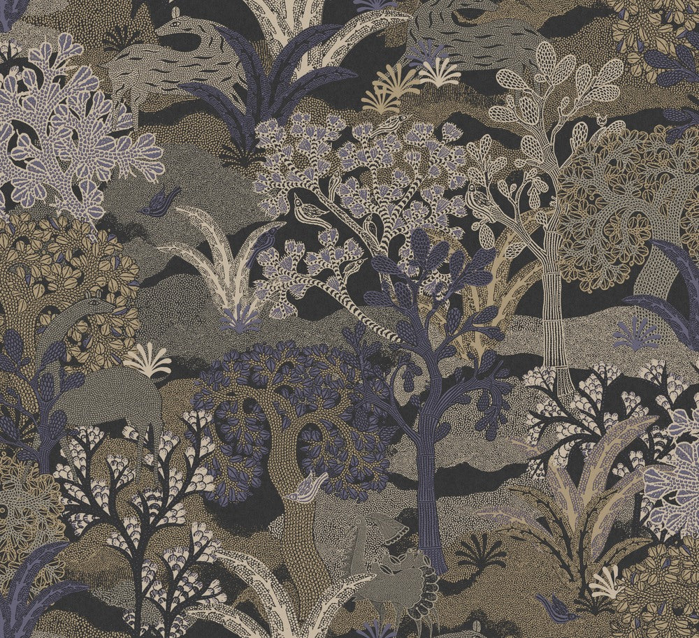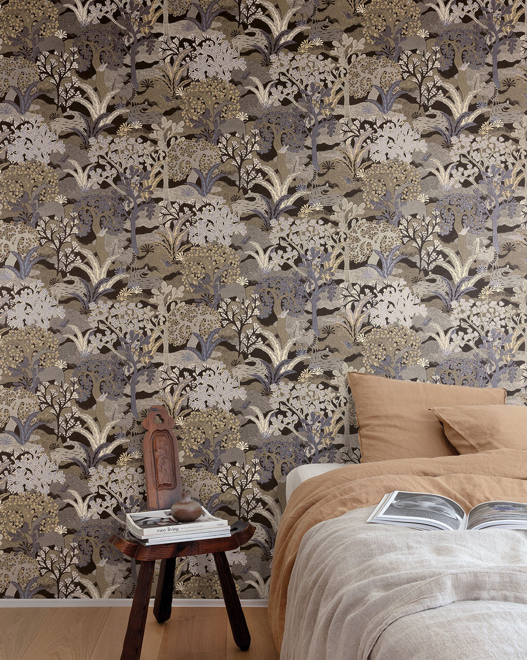 För in djup och dramatik i rummet med tapeten Fabulo Bronze. Ett intrikat skogsmotiv breder ut sig i nyanser av midnattsblått, brons och askgrått. Bland slingrande träd och växter skymtar du vilda djur skapade med små, detaljerade mönster som ger ett handgjort och textilliknande uttryck.
