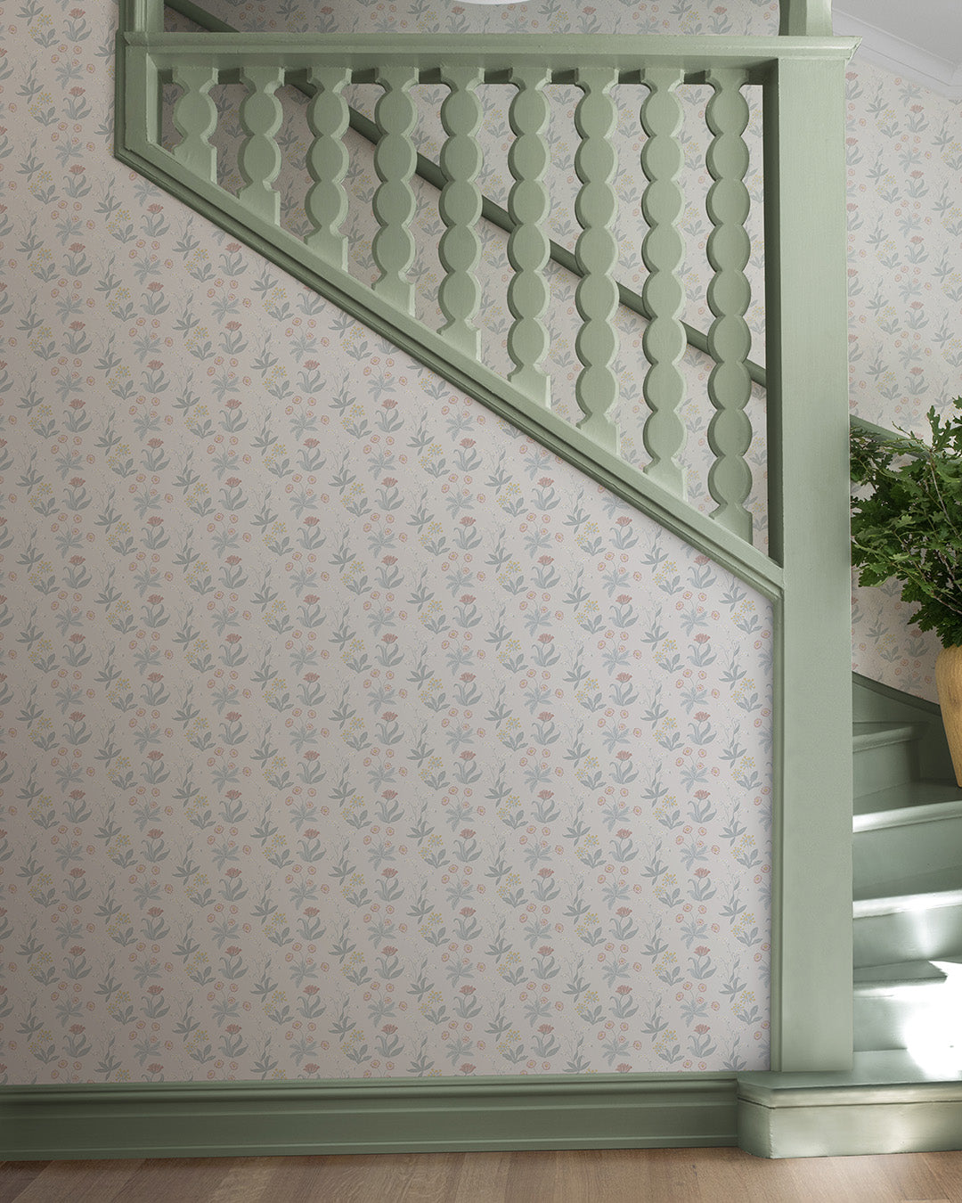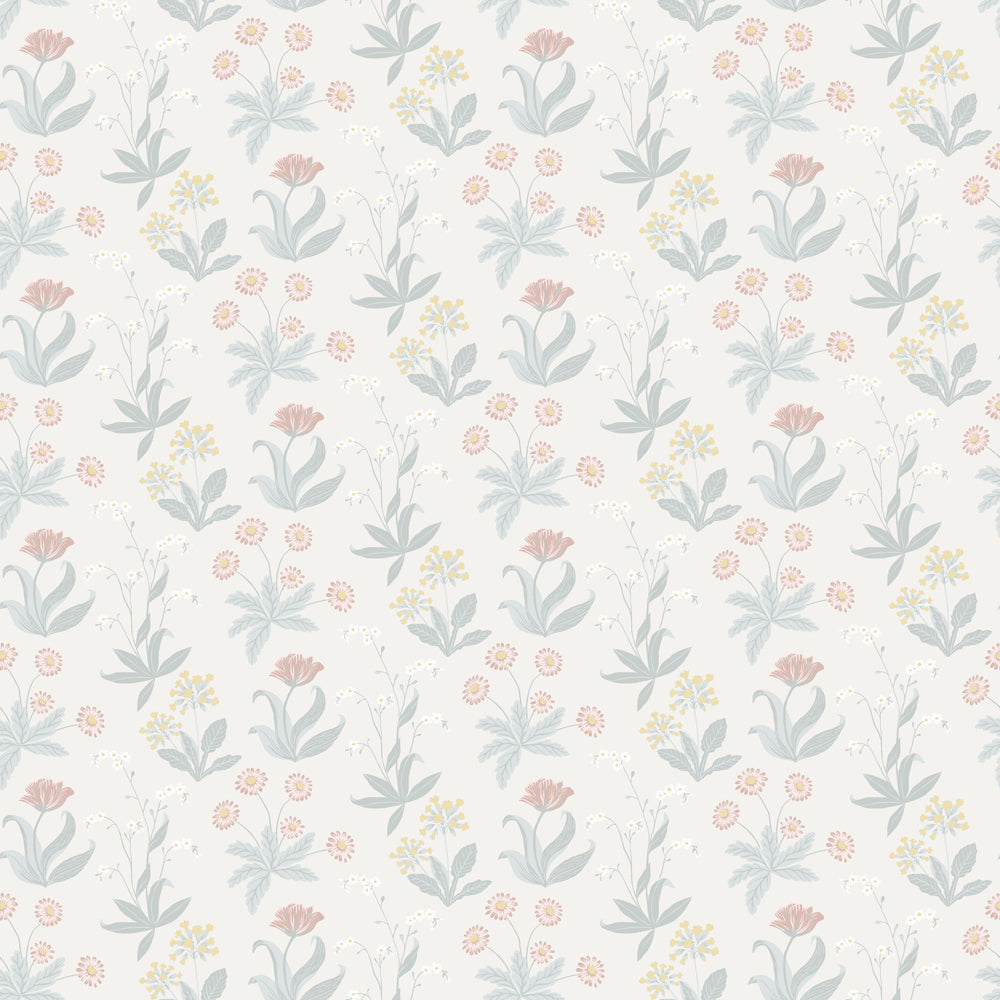 Underbara flora. Tapeten Fleur med enkla stiliserade blommor i ett mindre mönster skapar en vacker blomsteräng i ditt hem. Mönstret går i pudriga, svala toner av rosa, gult, ljusblå och vitt mot en lätt ljusgrå botten.