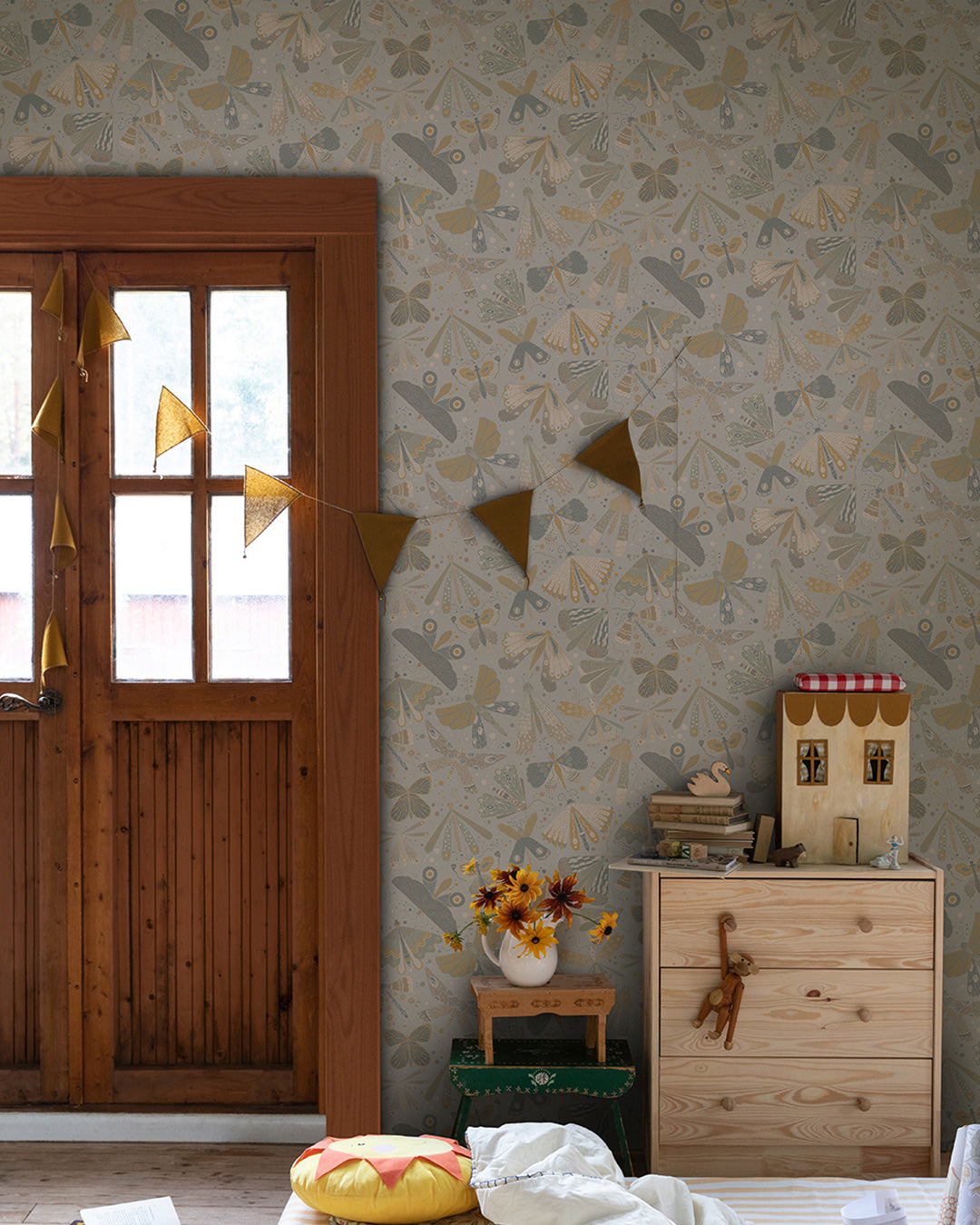 Sommarens bevingade vänner som är så vackra att se på, som sprider glädje och hopp om de så bara tittar förbi i några sekunder innan de snabbt dansar vidare och försvinner bort i solens varma sken. Med barntapet Flyga får du en påminnelse om sommarens vackra ting. Denna behagliga färgställning av ljusgrått, grågrönt, blågrå, lejongult och nougat skapar ett behagligt och rofyllt barnrum.