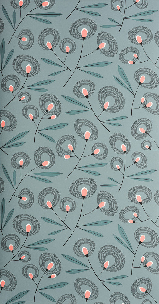 Tapet Halo Flower Mistry Blue i dov turkos nyans ger rummet en behaglig känsla. Blommorna i svart, mörkare turkos och persika bryter av fint mot bottekulören. De speciella blommorna andas lätt retro och är inspirerade av det australiensiska blommande trädet Gum Blossom vars exotiska blommor skapar en riktigt färgprakt vid blomningen.