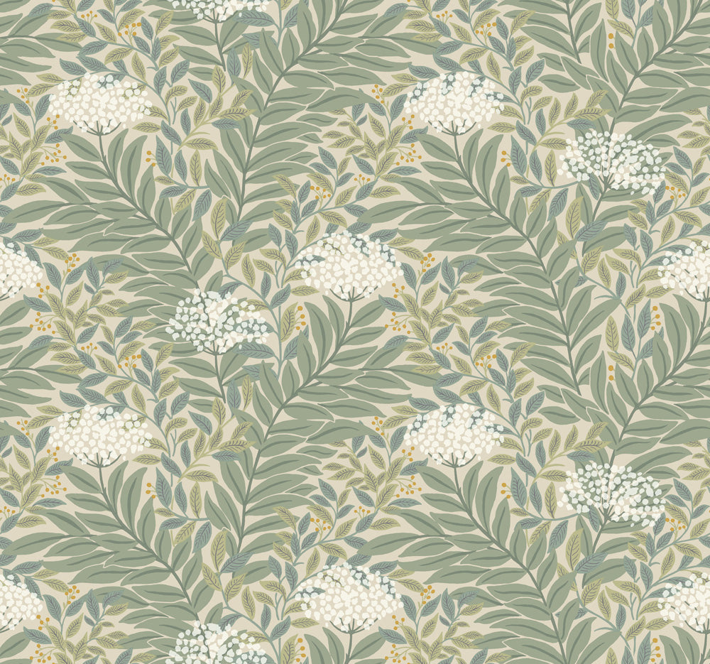 Tapeten Highgrove är en fyllig, heltäckande bladtapet där mjukt svängda rankor bygger ett levande, lager på lager-mönster. Bland de stora, avlånga bladen syns mindre bladkvistar och blommor och små bärklasar som lättar upp helheten. Botten är varm ljusbeige. Bladen går i dämpade grågröna toner med mörkare ådring som ger en handritad känsla. Blomklasarna är vita och bryts av med små bärprickar i guldmetallic. Helhetsintrycket är mjukt och harmoniskt med ett naturligt, ombonat uttryck. Ett lugnt grönt rum med subtila accenter.