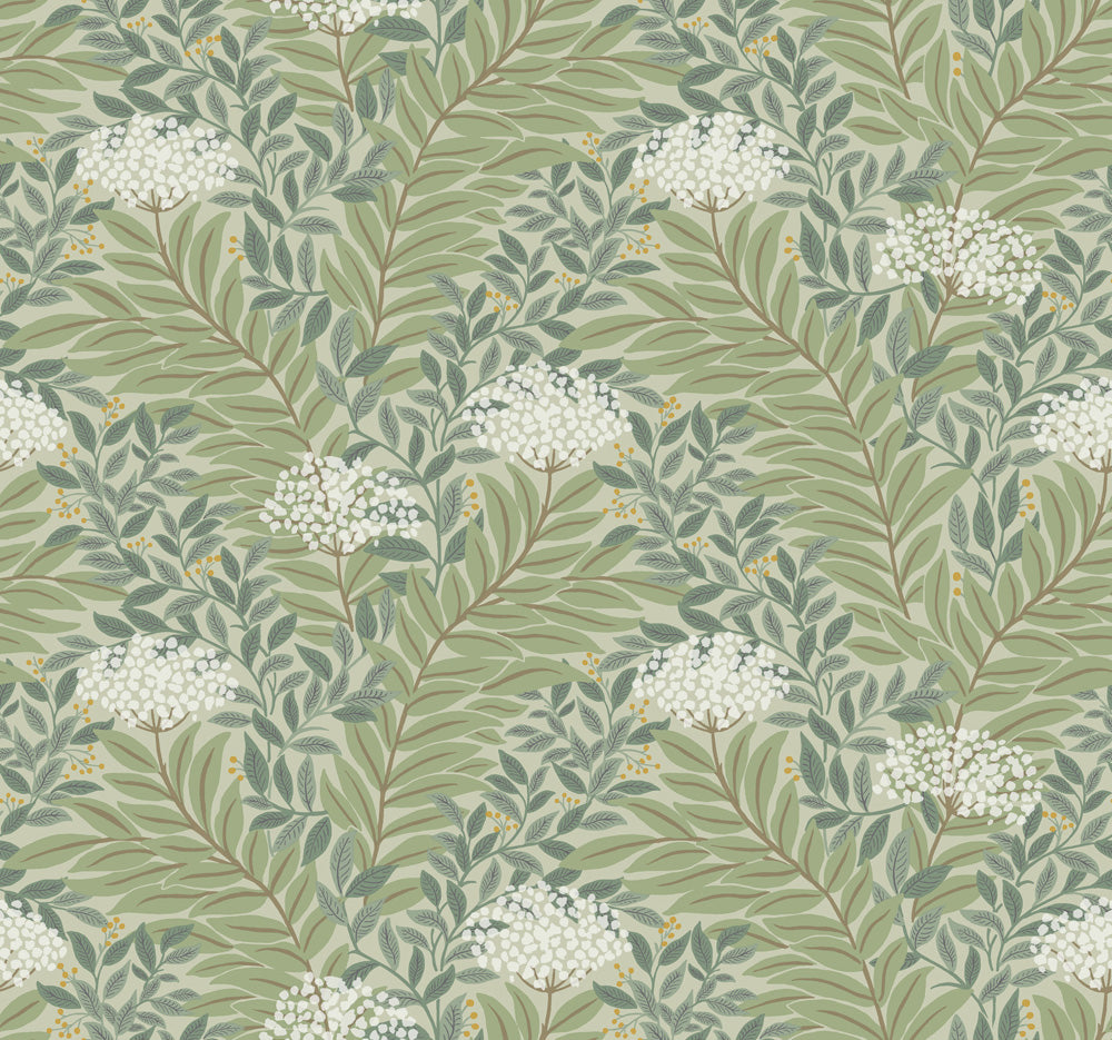 Tapeten Highgrove är en fyllig, heltäckande bladtapet där mjukt svängda rankor bygger ett levande, lager på lager-mönster. Bland de stora, avlånga bladen syns mindre bladkvistar och blommor och små bärklasar som lättar upp helheten. Botten är lindblomsgrön. Bladen går i dämpade nyanser av grönt med mörkare ådring som ger en handritad känsla. Blomklasarna är vita och bryts av med små bärprickar i guldmetallic. Helhetsintrycket är mjukt och harmoniskt med ett naturligt, ombonat uttryck.