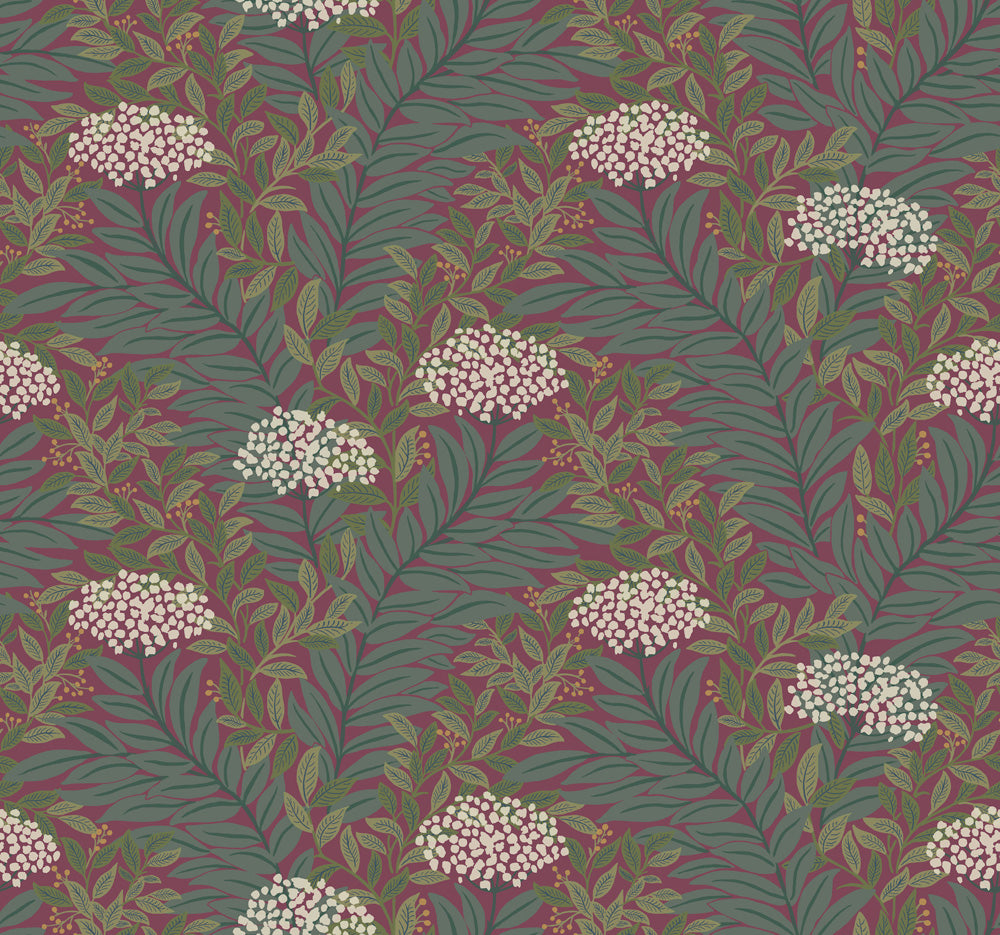 Tapet Highgrove är en fyllig, heltäckande bladtapet där mjukt svängda rankor bygger ett levande, lager-på-lager-mönster. Bland de stora, avlånga bladen syns mindre bladkvistar och täta blommor och bärklasar som bryter av ytan. Botten är vacker burgundy. Bladen går i mättade blågröna toner, med inslag av oliv- och gulgrönt Blomklasarna är i svag rosa ton och kompletteras av små bärprickar i guldmetallic. Helhetsintrycket är lummigt och ombonat med rik, varm karaktär där den vinröda botten ger djup och intensitet medan de gröna bladen och ljusa klasarna tillför liv och fin kontrast.