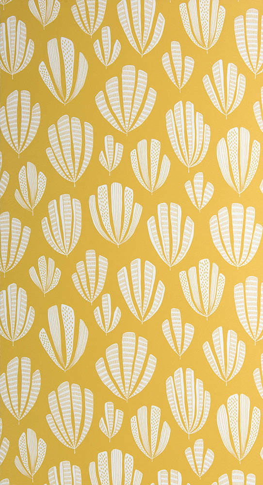 Denna handritade tapet bjuder på en härlig upplevelse. Den gula botten möts av ett vackert bladmönster i vitt, mönstret är hämtat från ökens botaniska växter och mynnade ut i abstrakta texturerade blad. Tapeten Hoja finns i fem olika färgställningar.