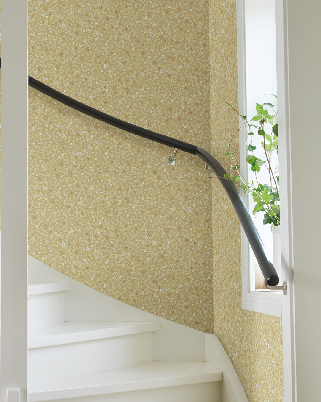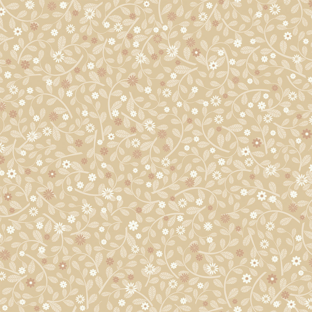 Småblommig tapet där vita och ljusbruna blommor sitter på en bottenfärg i naturnära nyansen have. Ett lättsamt botaniskt mönster som sprider en varm och gyllene känsla i rummet. Denna gulbruna tapet är perfekt för ett sovrum, kök eller en hall.
